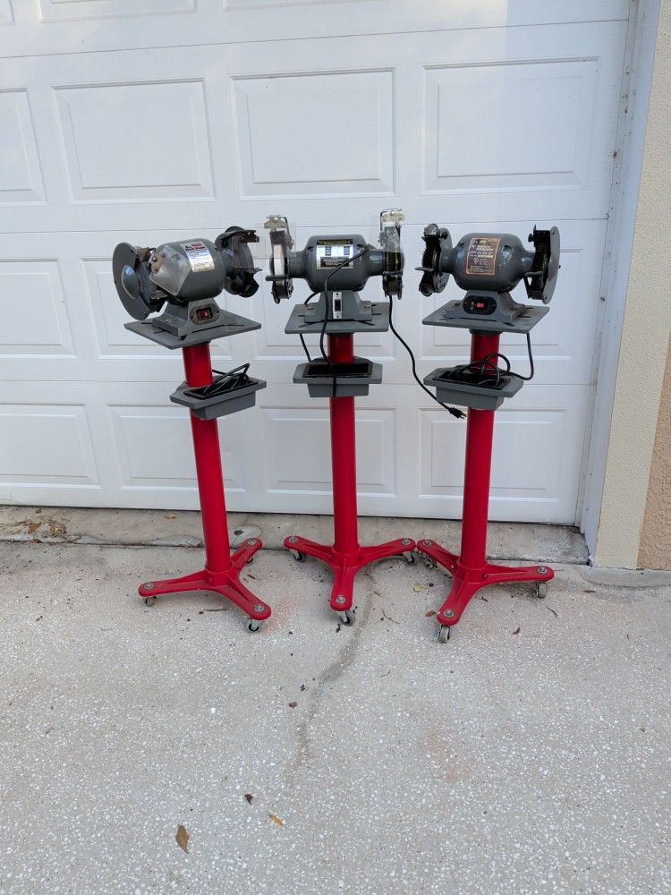 Three (3) available: $100 for Tool Shop (contact info removed): 1/2HP, 3.5A $70 for Edison Craft BG600: 1/3HP, 2.5A (one shield is broken) $60 for Collins Tool Quality LF-137: 1/4HP, 3A All 120V, 3450 RPM, red heavy duty cast iron pedestals have swivel casters with brakes. Discount available for multiple purchases.