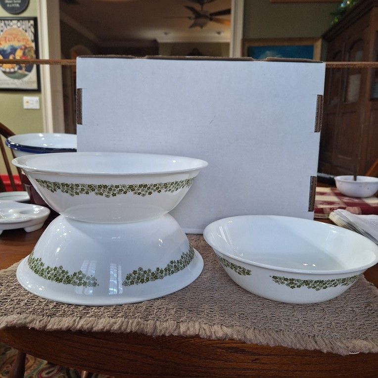 These vintage white bowls feature the "Spring Blossom Green" pattern, also known as "Crazy Daisy," which was first produced by Corelle in the 1970s. The bowls are made ofThese vintage white bowls feature the "Spring Blossom Green" pattern, also known as "Crazy Daisy," which was first produced by Corelle in the 1970s. The bowls are made of lightweight, durable, and break-resistant Vitrelle glass. This pattern is highly sought after by collectors and features a border of green daisies. lightweight, durable, and break-resistant Vitrelle glass. This pattern is highly sought after by collectors and features a border of green daisies and matches the Pyrex pattern. The large bowls (10") are hard to find ($48/EACH) & 8.5" ($30). IF buying all together will discount $115. Great condition. Porch pickup. (KIT).