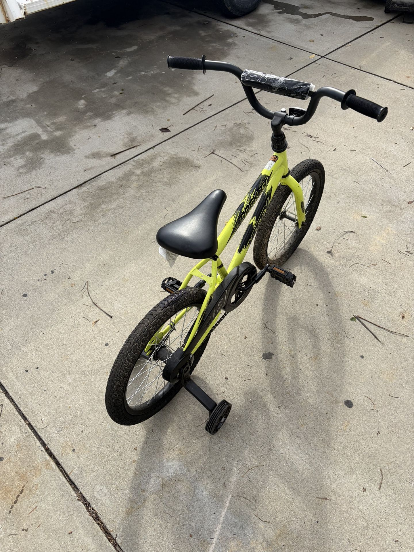 Yellow huffy kids bike with training wheels perfect for little kids Tires need air Pick up only
