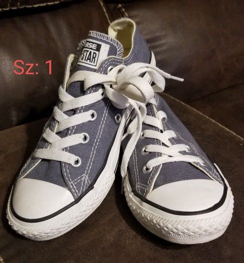 Kids Converse All Star Chuck Taylor size 1. Grey with white threading. Barely worn and always with socks. Pre-owned, like new cond. Check out my other listings.