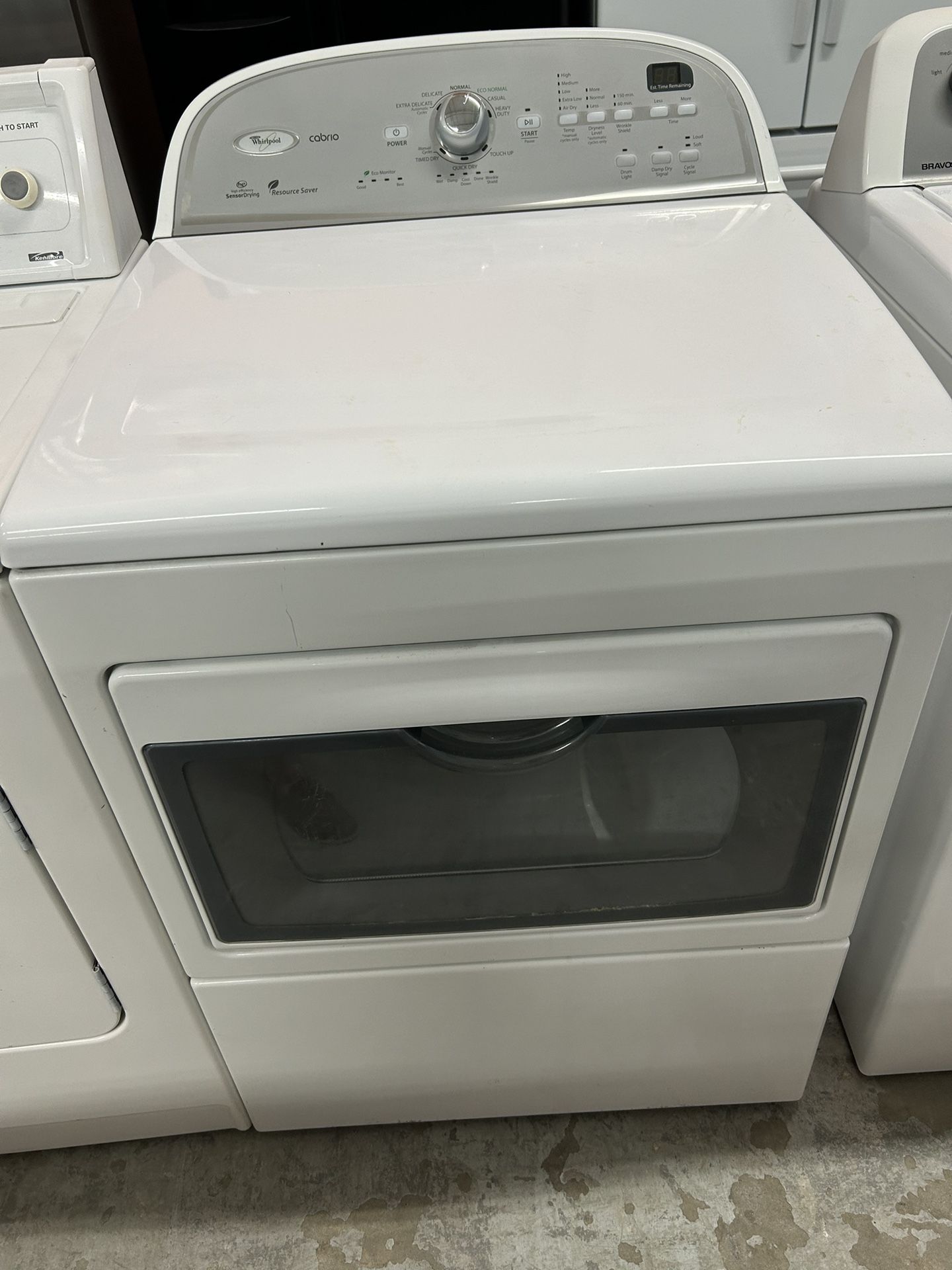 We have a Whirlpool Cabrio dryer with glass pull down hamper door. Dryer has 10 cycles 5 fabric care temperatures and wrinkle shield. Comes with warranty. Financing and delivery available. Questions please call three two one (contact info removed).
