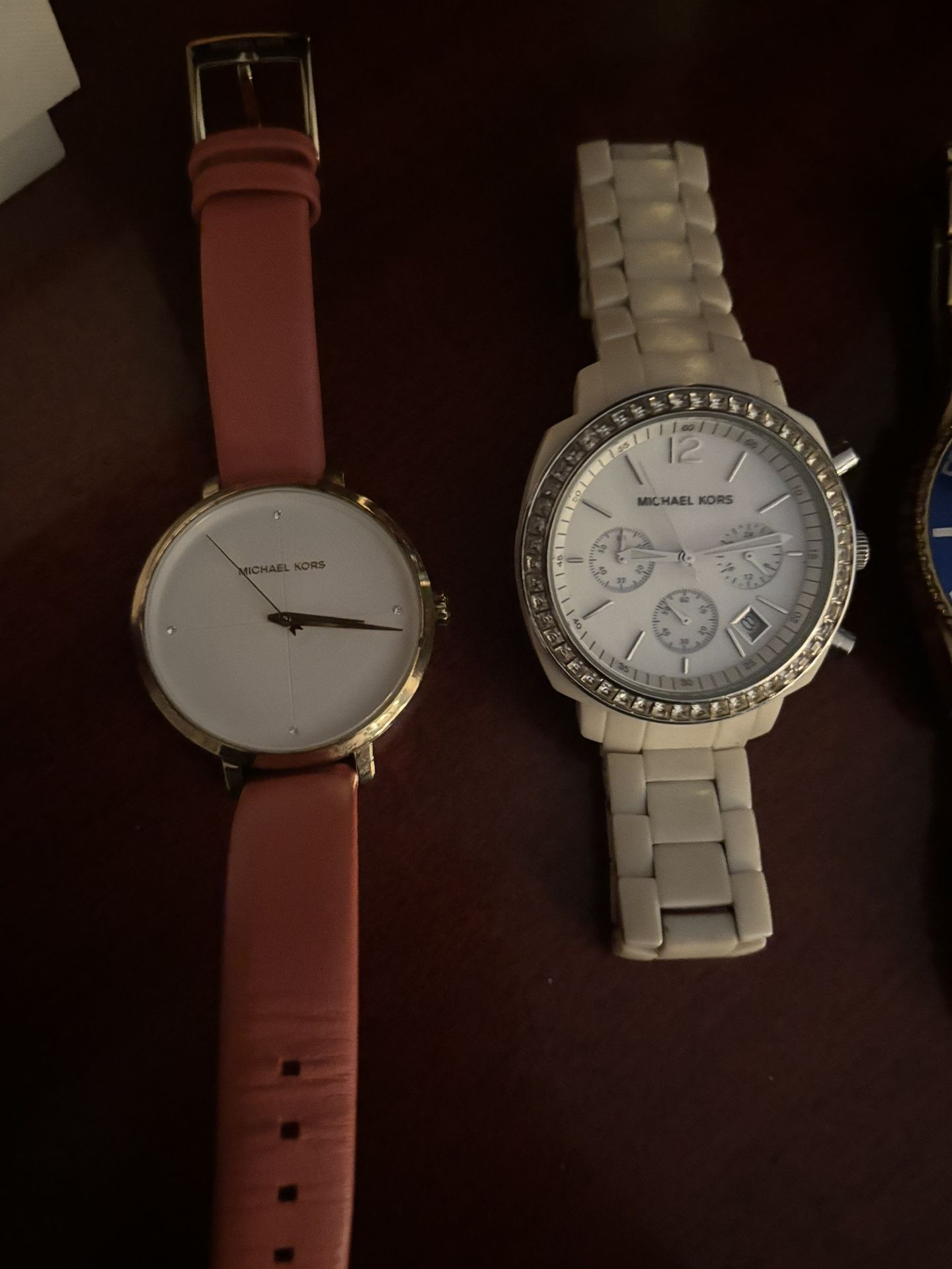 Both Michael kors watches were both Valentine's Day presents from my ex and I don't want them anymore. They are both super cute. The one on the left has a leather burnt orange color strap and is silver and has bling in 12-3-6-9. $25 The one on the right is more of a harder white band with a white face and bling around the face. $50
