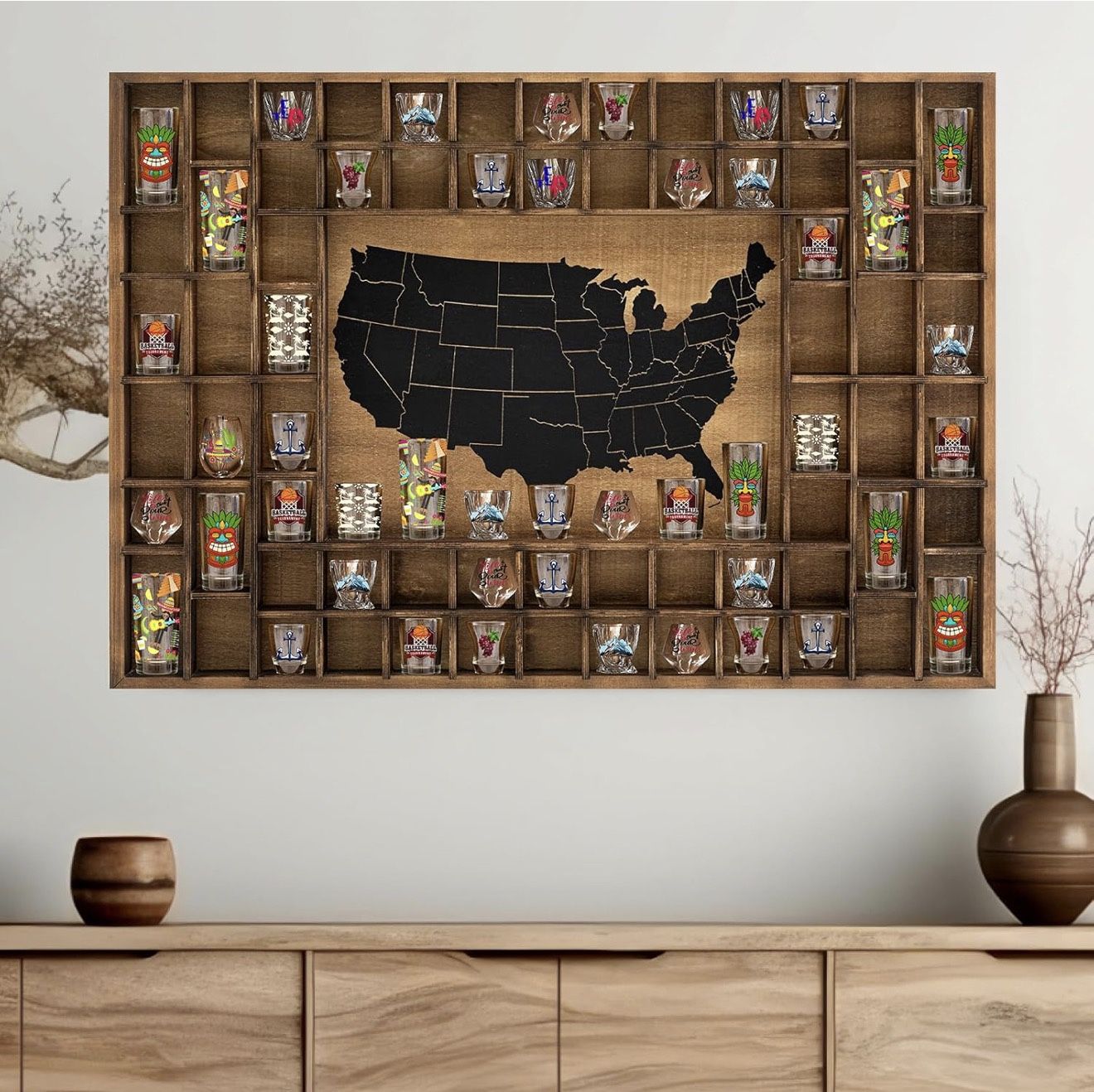 Large World Map Shot Glass Display Case – 40” x 28” Rustic wood wall display with 68 slots for various shot glass sizes. Great for bar décor or collectors. • Size: 40” x 28” • Holds up to 68 glasses • Wall-mounted