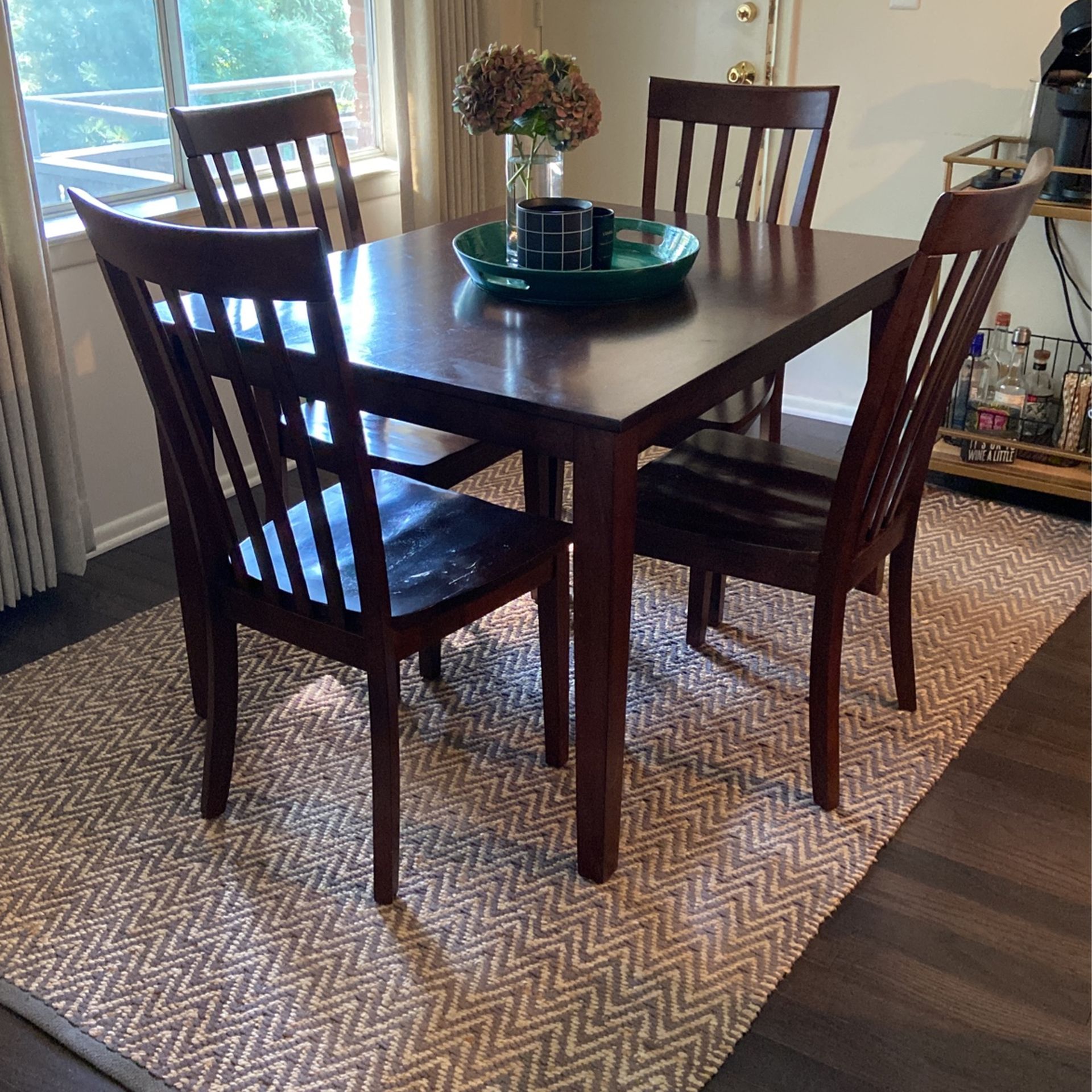 • 5-Piece dining set includes dining table and 4 chairs • Solid hardwood frame materials with wood veneers • Sturdy, solid construction There are imperfections like scratches or dull spots throughout the pieces from normal wear but great for a first time apartment,small space or college dorm! Or, an extra table for your holiday gatherings you won’t have to worry about!