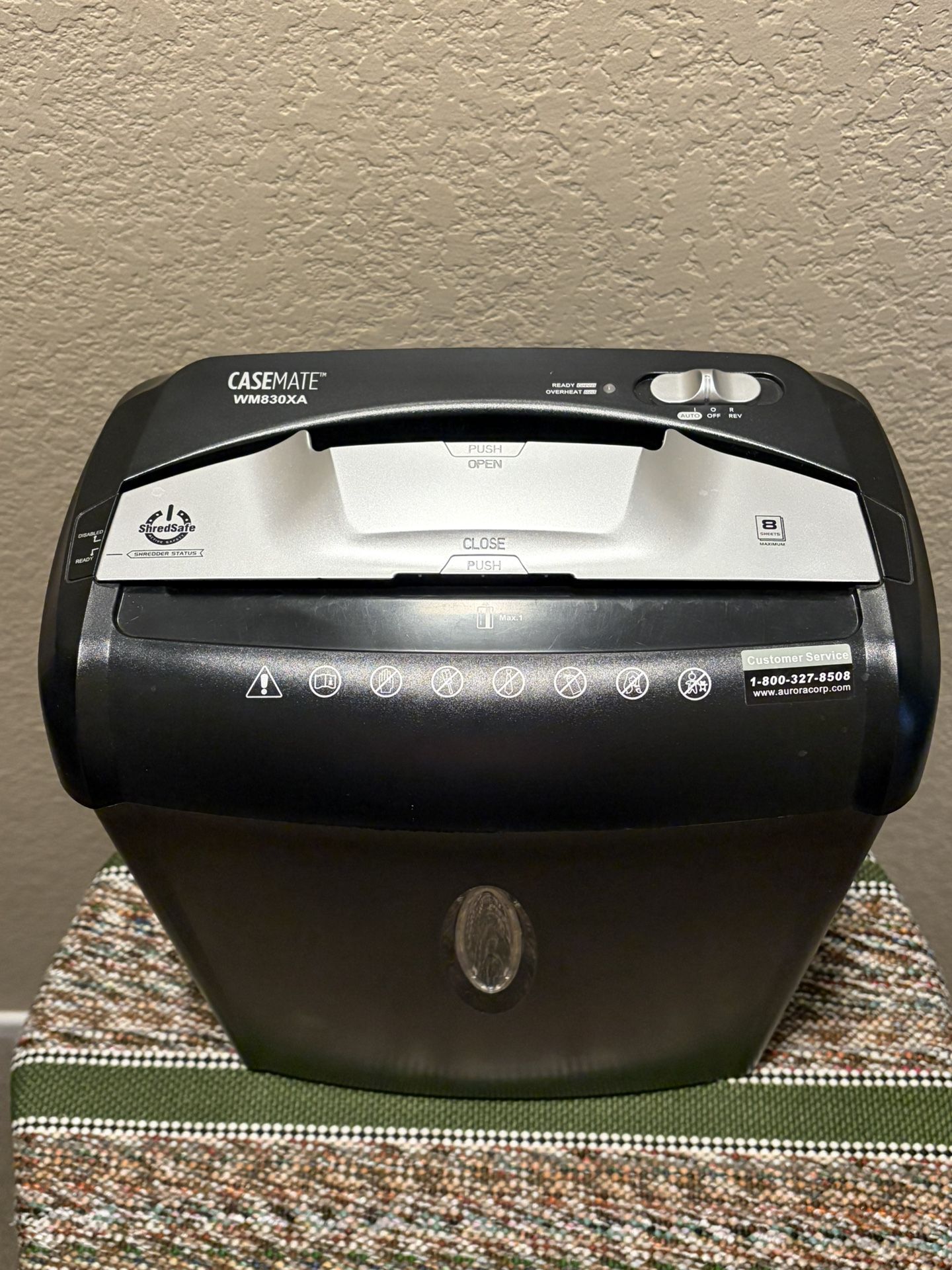 Casemate 8 sheet paper shredder. Used a few times. Great for home use. The only reason for selling is I have more than one and it is unneeded. Nothing wrong with it and in new condition No tax, price out the door.