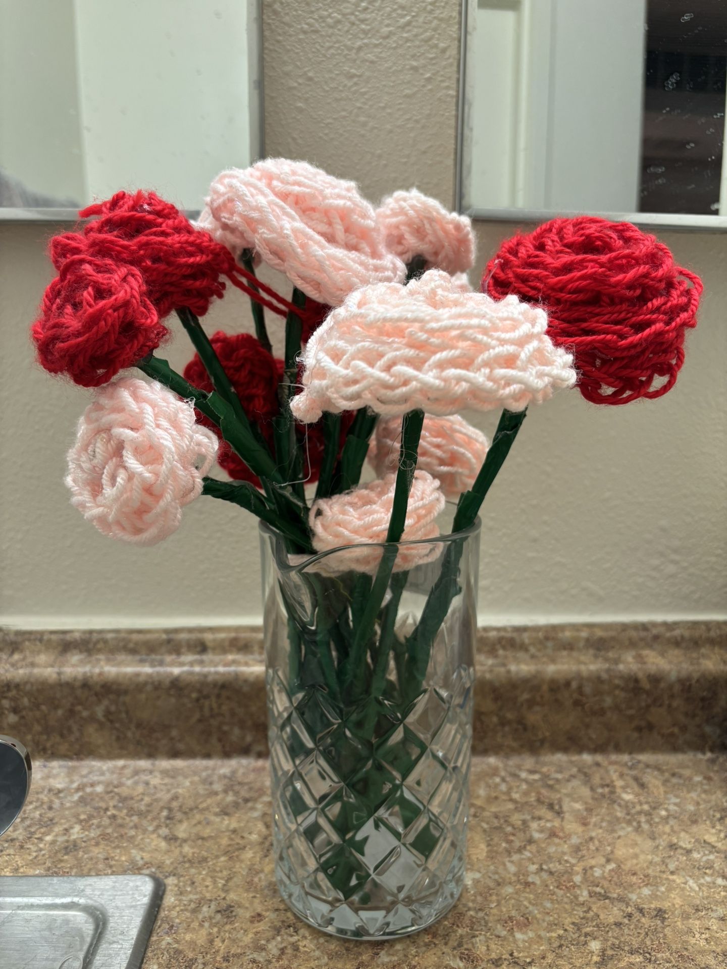 13 handmade finger-crocheted roses (vase optional if you want to exclude it). These flowers are perfect as a long-lasting gift, home décor, Valentine’s Day gift, or a unique handmade alternative to real flowers. They never wilt and make a sweet keepsake! $25 for the full bouquet OBO