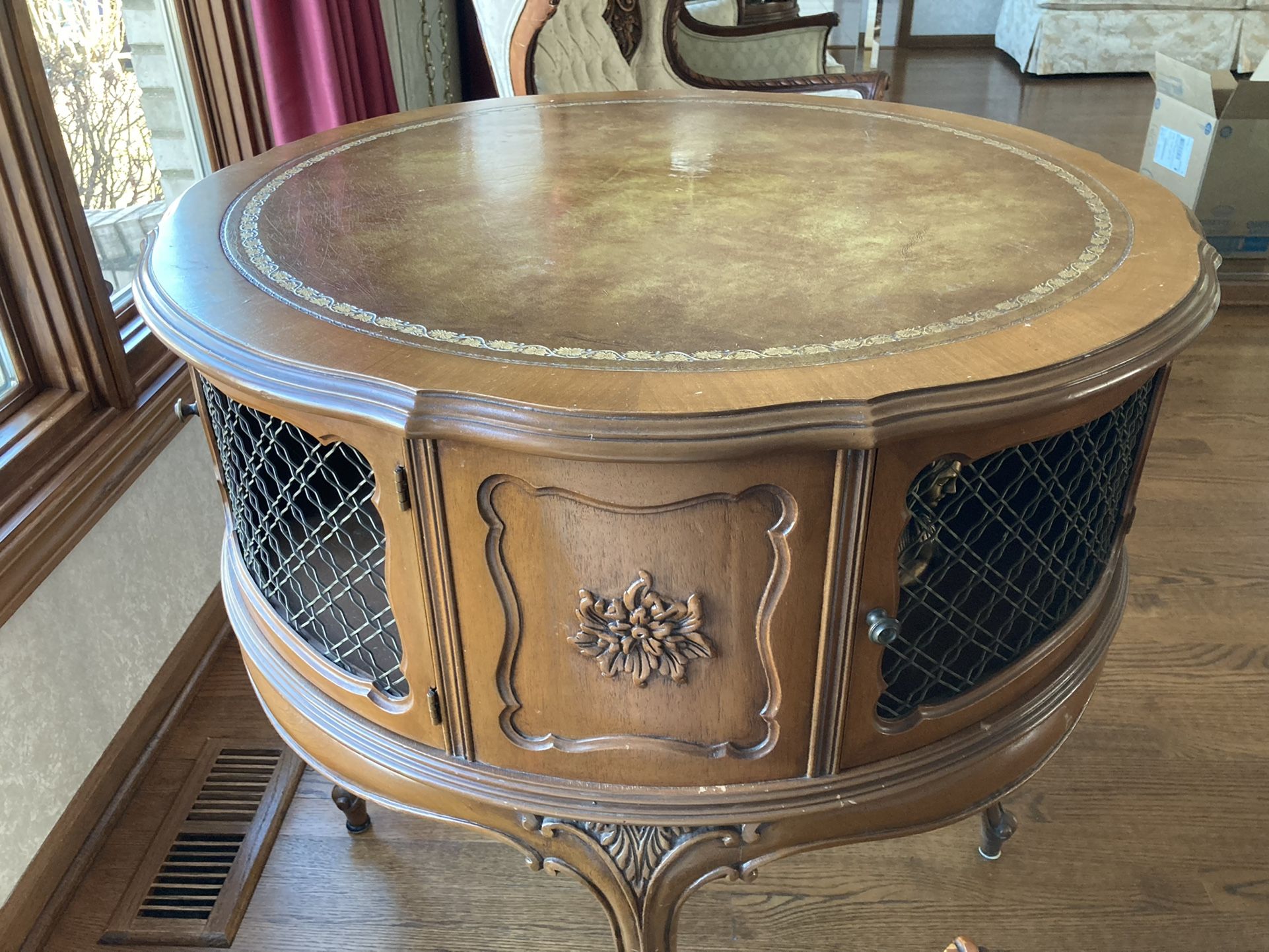 French Provincial Wood Occasional/Hall DRUM TABLE With Leather /Top