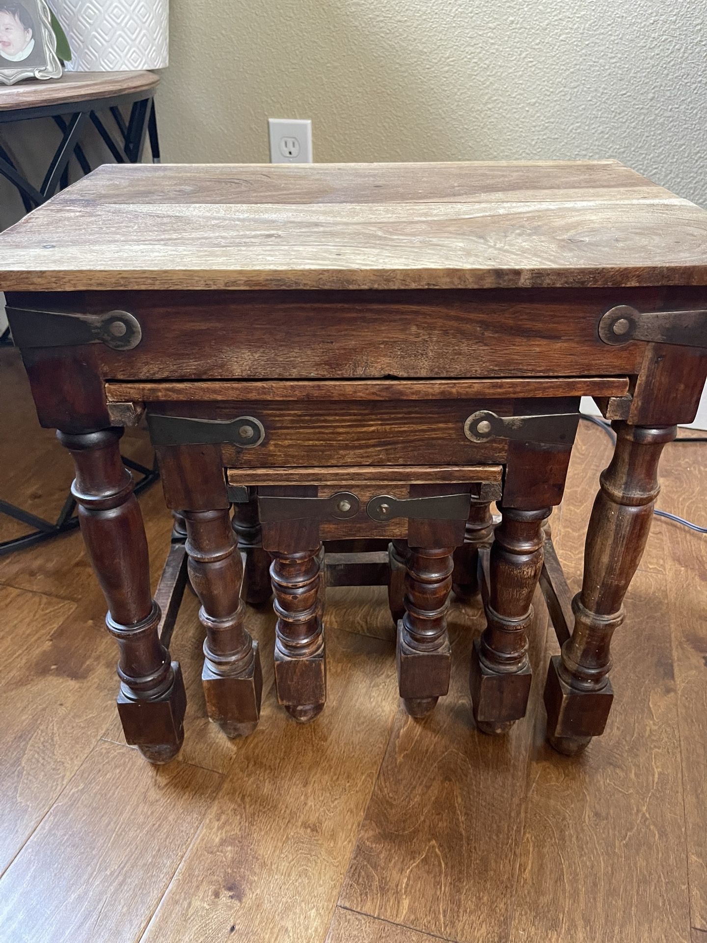 17” 3/4 length 12” width 18” Hight Indian solid wood Saves space as 2 tables go under one