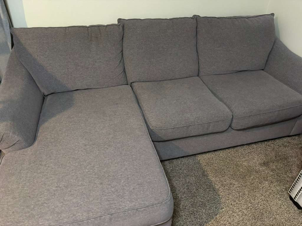 Comfortable L-shaped sectional sofa in a modern gray color. Clean, supportive cushions and a layout that’s great for lounging, movie nights, or family living rooms. Neutral tone works well with most décor styles. • L-shaped sectional design • Comfortable seat and back cushions • Neutral gray fabric • Solid and sturdy construction • Smoke-free home ⚠️ Condition note: There is a small damaged area at the bottom (not very noticeable and does not affect comfort or functionality). Priced accordingly. Recently cleaned by professional. ⚠️ Moving note: This sofa is large and heavy — will require at least two people to move. Pickup only. Condition: Good (minor cosmetic damage) Pickup: Local pickup only – please bring help and an appropriate vehicle