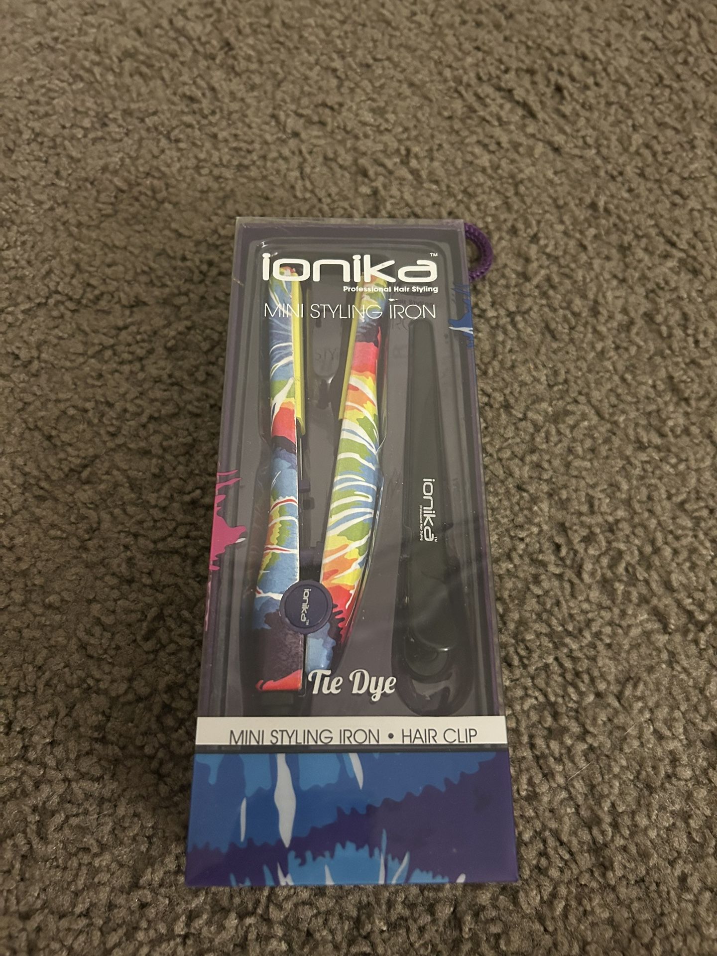 Travel size hair iron from IONIKA with tie dye design. New, unused.