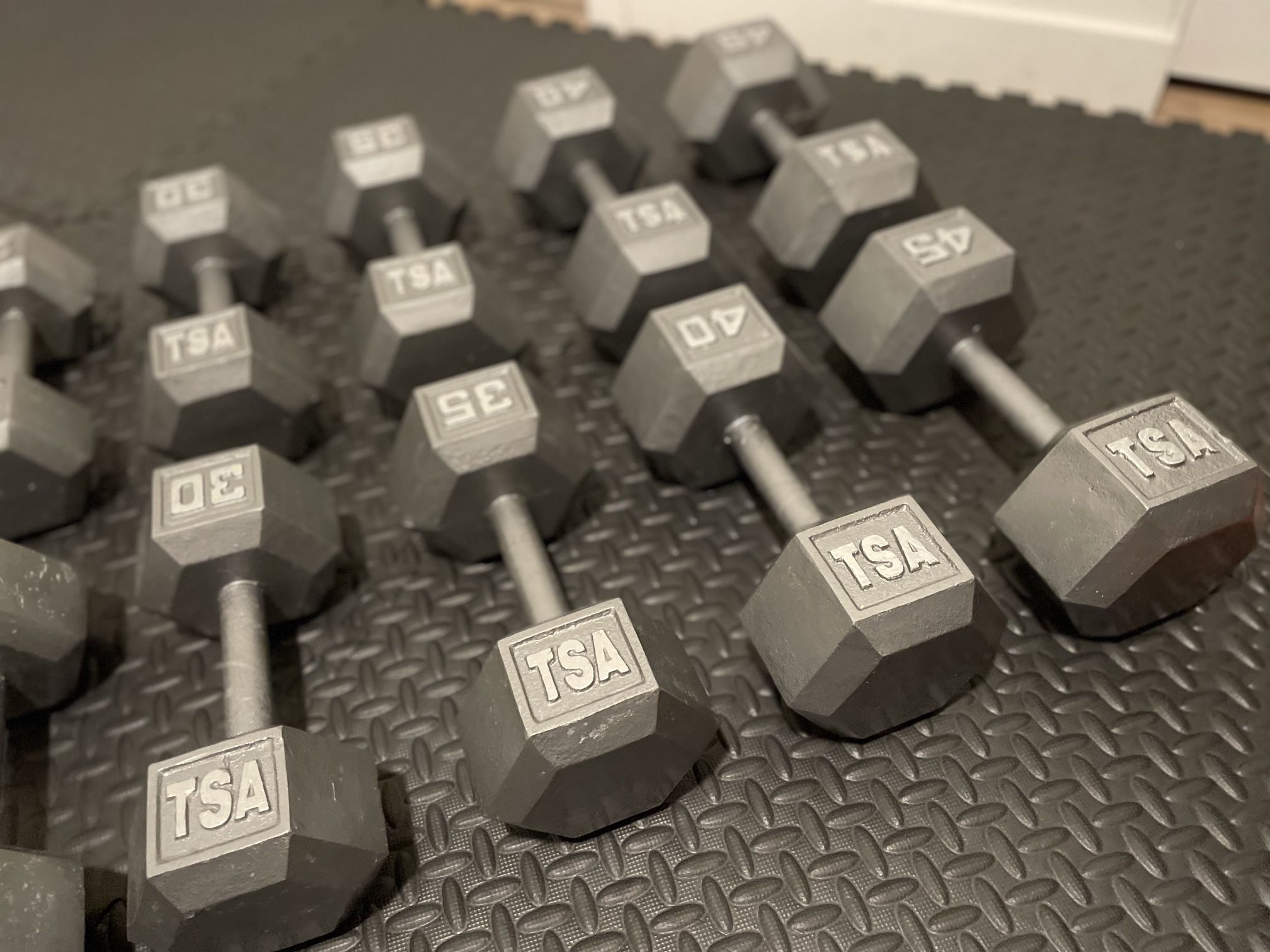 Set Of Cast Iron Hex Dumbbells From 10# To 45# Total Of 440 lbs Basically New