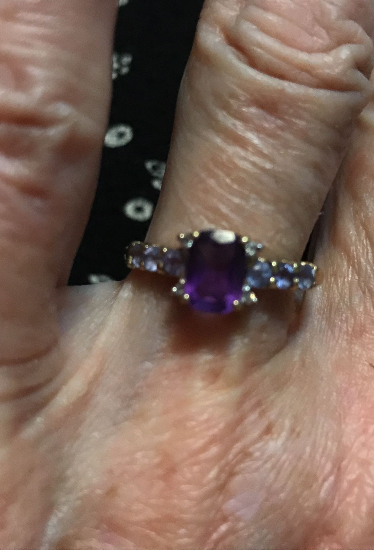 14k this ring has sizing bars and can be taken off if needed right now it will fit a size 61/2 to a 8