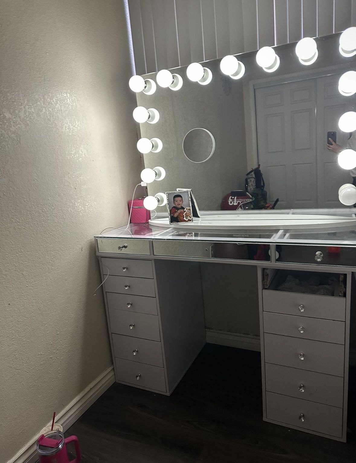 Beautiful large vanity for sale. Originally paid over $1,000. One drawer came off, but I still have the piece—it just needs to be drilled back into place. Selling because it doesn’t fit in my new apartment. Great deal for someone willing to do a quick fix!