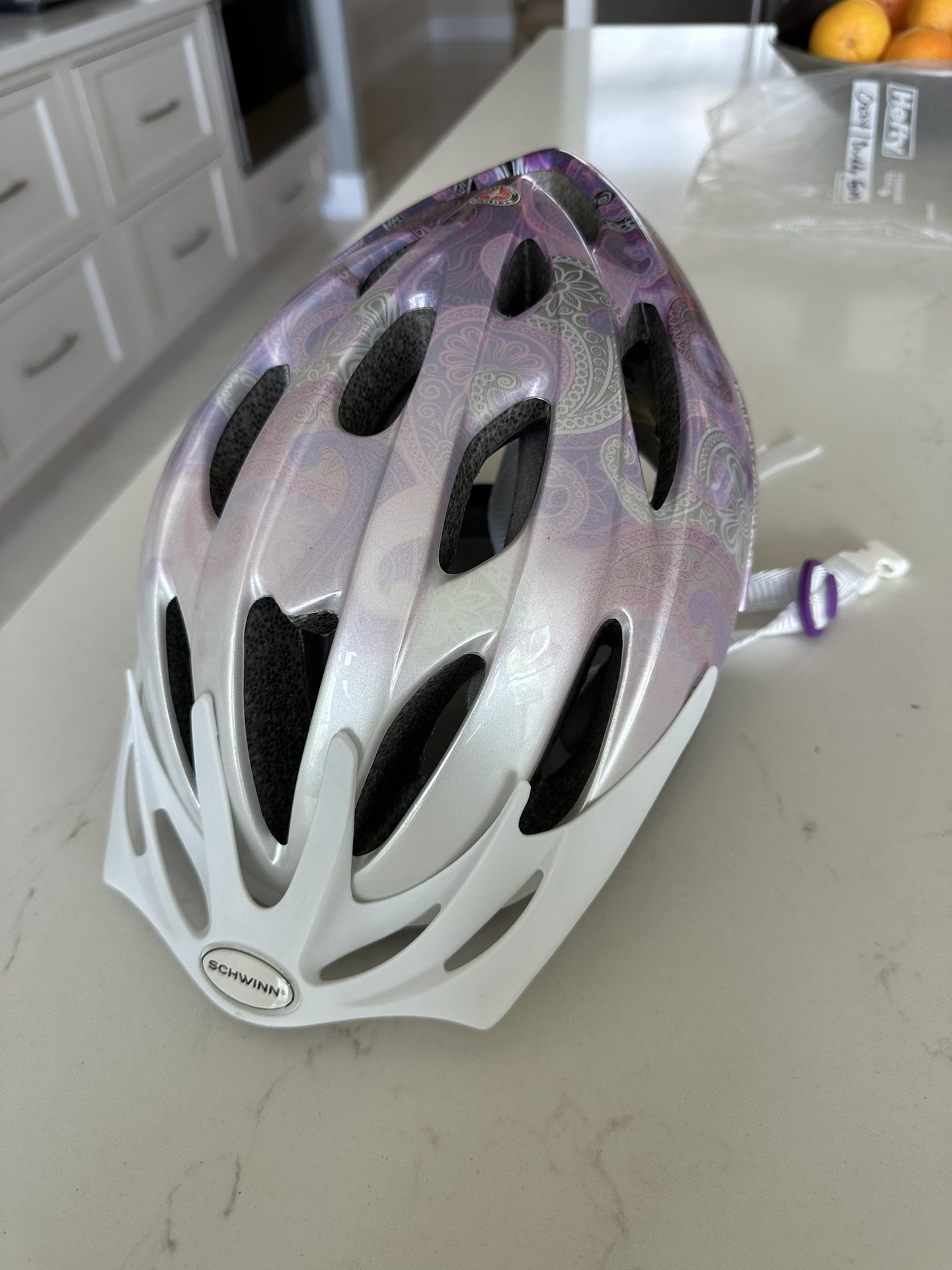 Never used purchased for granddaughter that brought her own! Just found it in a closet! White straps purple pink paisley print New condition
