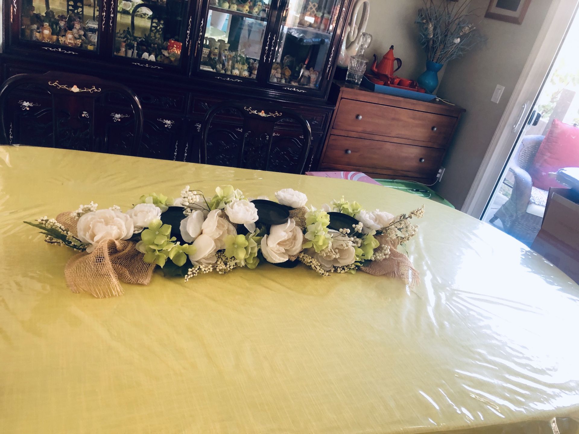 Elegant centerpieces Candle and glass not included The green flower one - $22 for longer table The pink flower one - $18 for shorter table