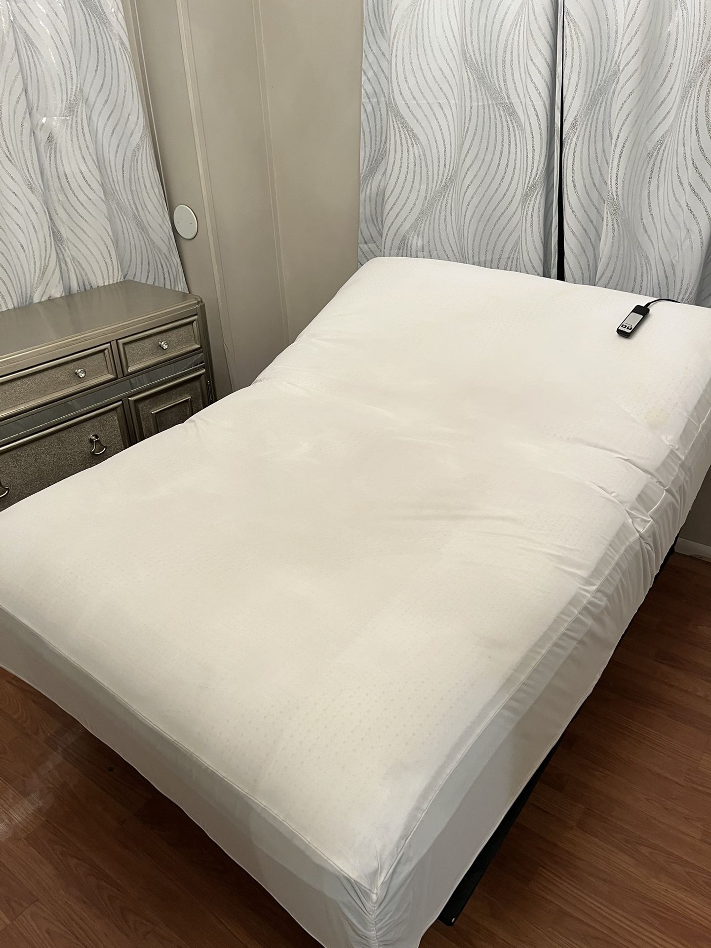 Adjustable bed frame, and mattress. Mattress has always had a cover on it and is in great shape. Frame had a motor with a remote to go up and down. PICK UP ONLY