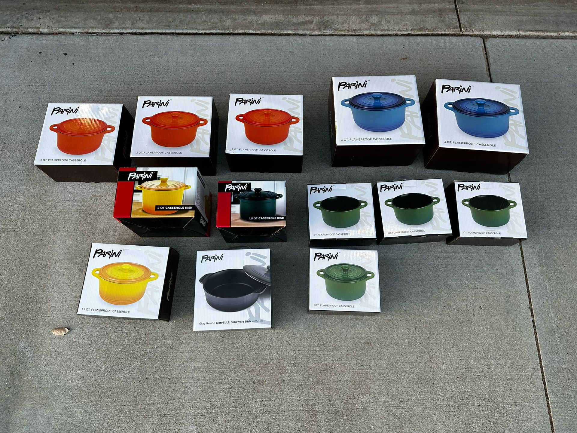 All brand new. 13 parini Casserole Dishes - All For One Price Of $80. $80 for all of them. Located in orangecrest side of Riverside