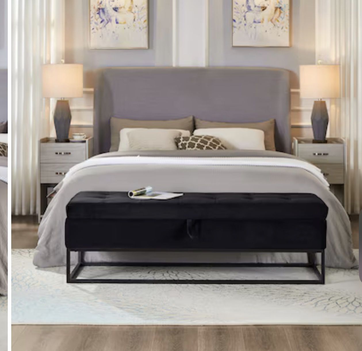 58.6” storage bench ottoman upholstered velvet black color and black metal base. New. No stains or damages