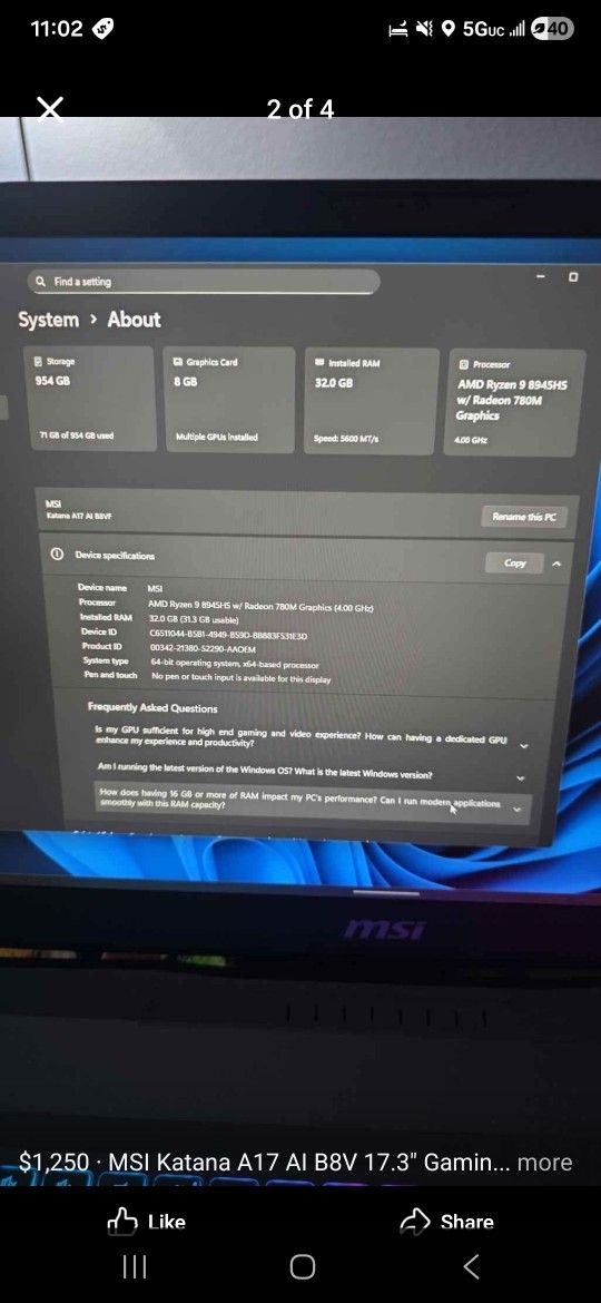 MSI Katana A17 AI B8V 17.3" Gaming Notebook - AMD Ryzen 9 8945HS with 32GB Memory - 1TB SSD - Black Comes with charger and original package Don't need it, not what I expected nothing wrong with computer. Will trade for a Samsung Galaxy tab s11ultra with Keyboard Shoot a good offer, no low ball