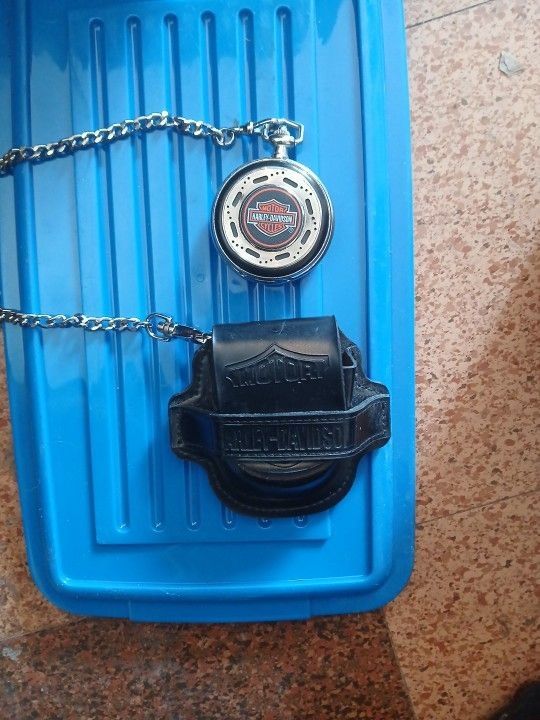 Harley Davidson Pocket Watch With Chain And Leather Carrying Case