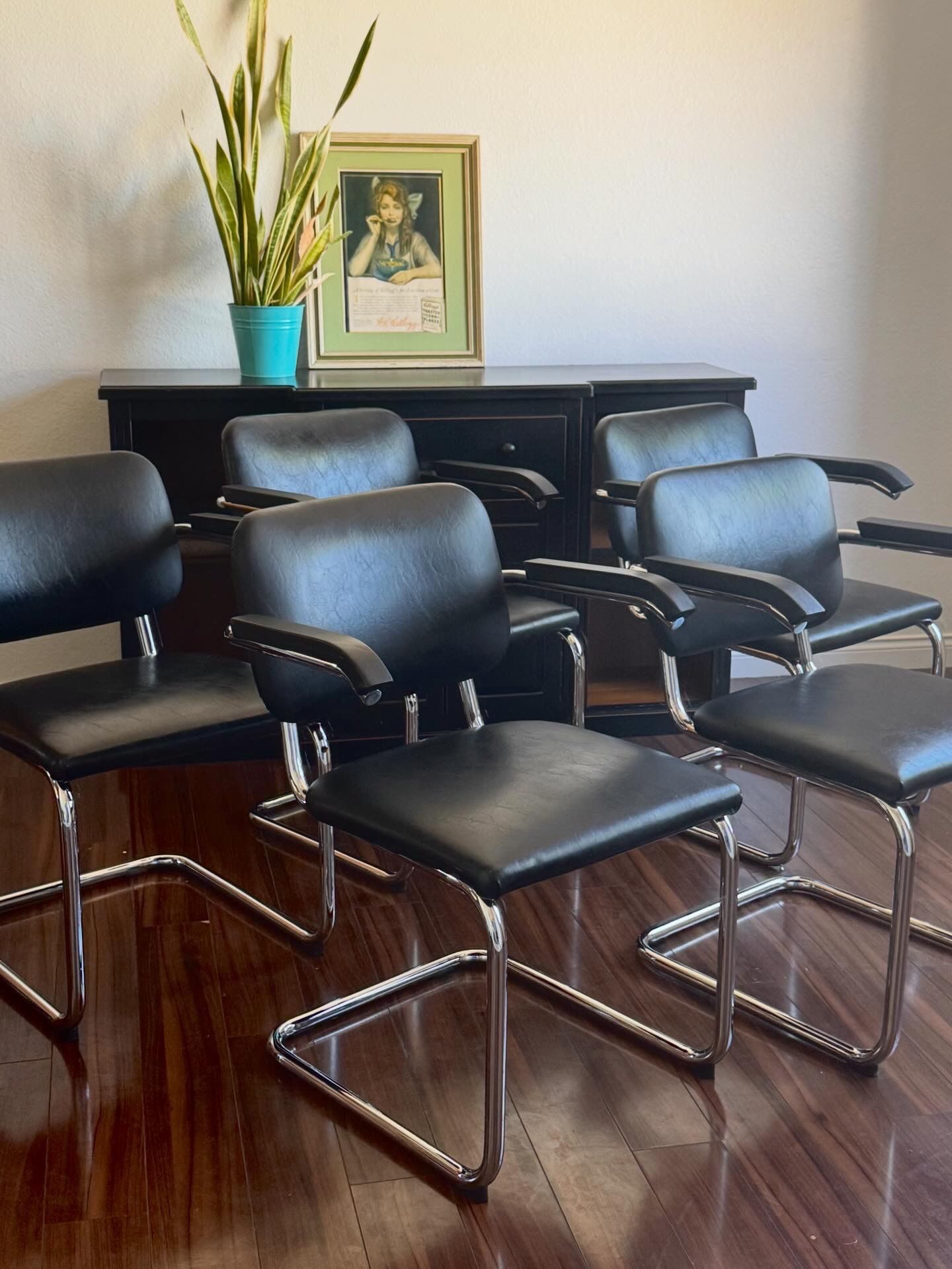 $150/each, 5 total available, discounted if you purchase all 5! (I also have 6 of the matching chairs with out the arms as seen in last photo) Stunning set of 5 Cesca arm chairs. They are in excellent condition and will look incredible in any room. They have all been cleaned and polished to a shine. The chrome pops against the black seats! These are very high quality, made by Gordon International. They are very comfortable and sturdy and will be a great addition to your home. Delivery is available for a fee or pick up is in Oceanside.