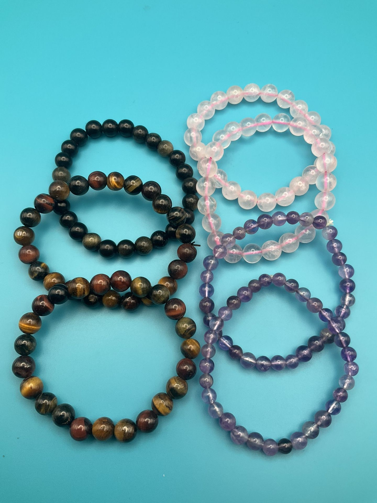 Ready for selling 10 rose quartz. 10 amethyst. 10 obsidian. 10 tigers eye with 3 colors (gold, red, blue) 40 bracelets $300. The tiger I usually retail for 15-20$....rose quartz & obsidian10-15$