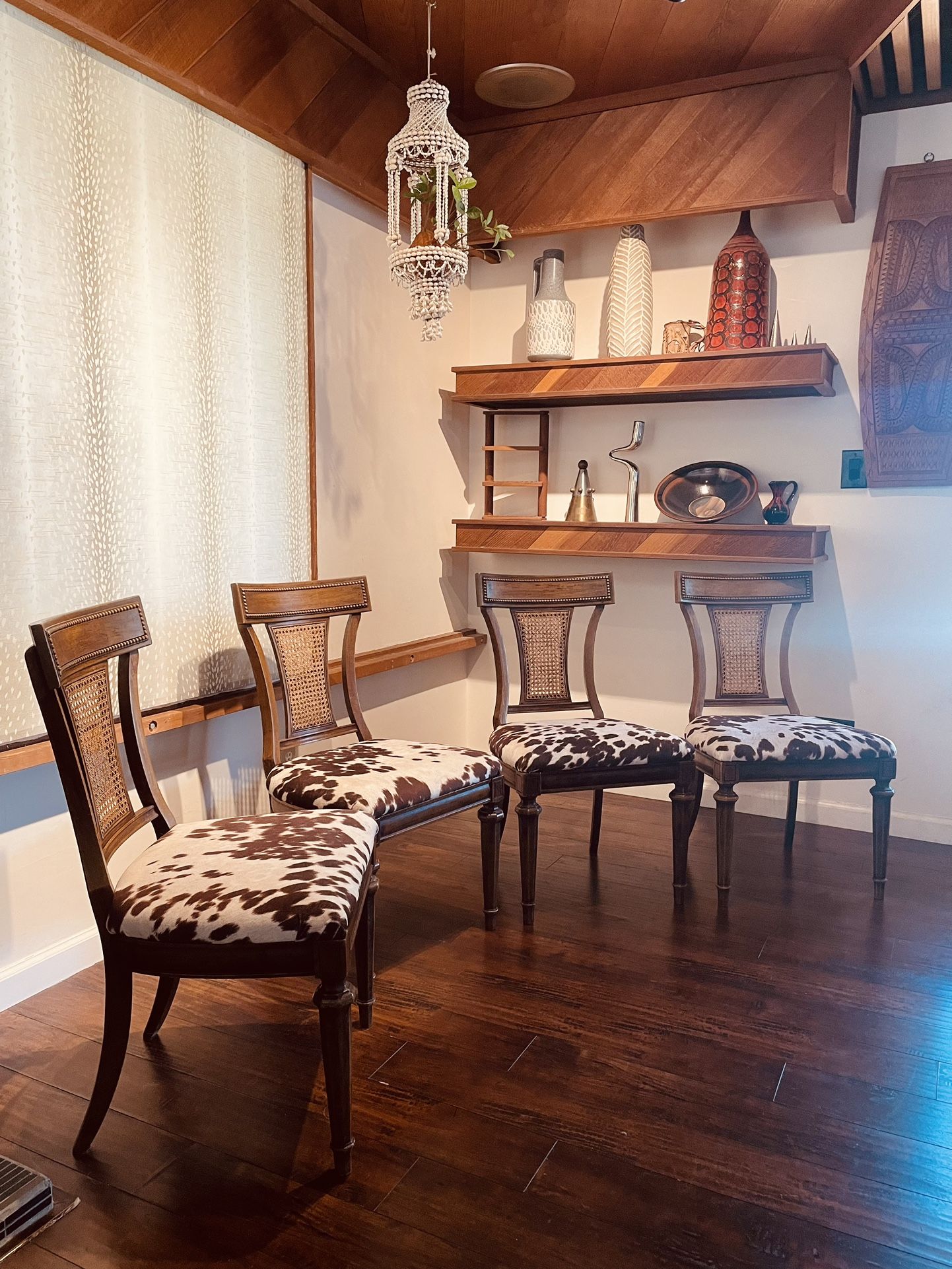 Vintage Designer Cow Pattern Dining Chairs - Mid-century chairs -style Restoration Hardware Includes table for free with chair purchase