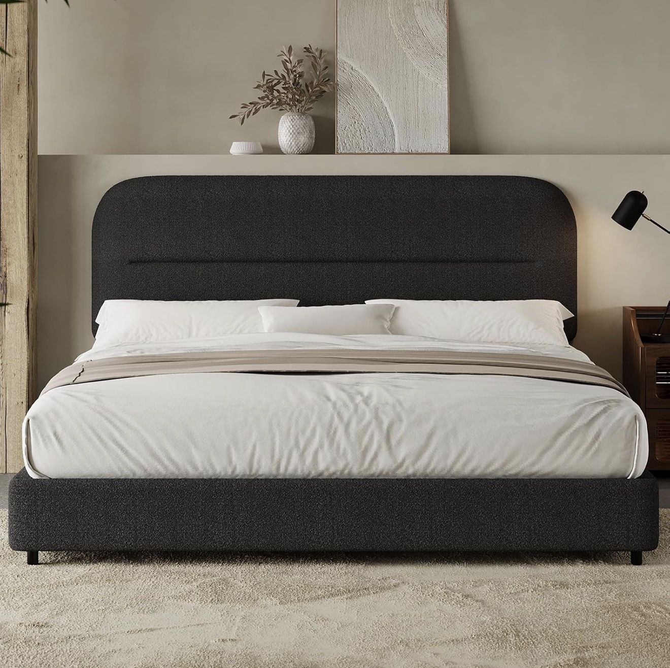 Top highlights Style Modern Size Queen Special Feature Adjustable Color Black Frame Material Wood & Metal Product Dimensions 82.7"L x 60.9"W x 41.3"H Fluffy Boucle Fabric: This queen size bed frame is upholstered in a cloud-like terry fabric that is soft to the touch while providing a fluffy texture. This soft upholstered bed frame fills your home with warmth and calm Curved Anti-collision Design: The headboard and footboard of this boucle bed frame queen size feature a clean and sleek curved design, it contains beautiful appearance while also reducing daily collision damage Modern Minimalist Bed: This queen size bed frame with headboard is designed with clean and stylish curves and lines throughout, adding a smooth and cozy line of beauty to your room, creating a comfortable sleeping space Sturdy Construction: The beige bed frame consists of sturdy legs, a supportive metal frame, and solid wood slats with silent foam to enhance the bed's solid stability while safeguarding the sleeping experience Easy to Assemble: We have provided the necessary assembly tools and clear assembly instructions for this boucle queen bed frame. Faster assembly by two people saves time and ensures smooth assembly Product specifications Style Style Name Modern Color Black Finish Types Boucle Materials & Care Frame Material Type Wood & Metal Material Type Boucle Measurements Size Queen Item Dimensions L x W x H 82.7"L x 60.9"W x 41.3"H Item Weight 70.5 Pounds Features & Specs Additional Features Adjustable Maximum Weight Recommendation 800 Pounds What's in the box Headboard Footboard Slat