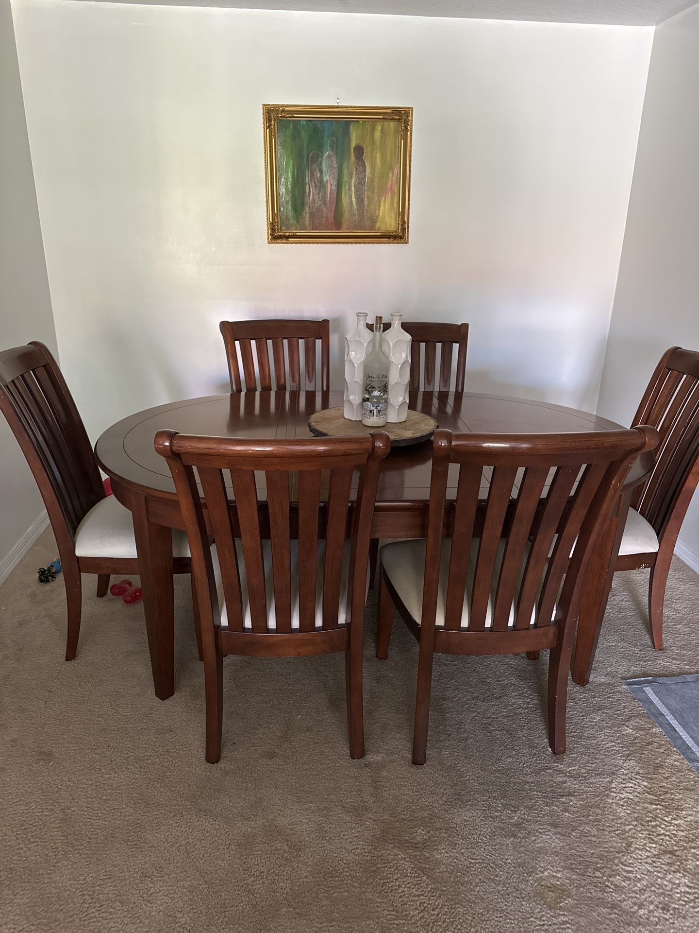 Beautiful and sturdy 6-piece dining set. Includes oval table and 6 matching chairs with cushioned seats. Seats are comfortable and clean. Perfect for family meals or entertaining. In great shape, no cracks. Local pickup only.