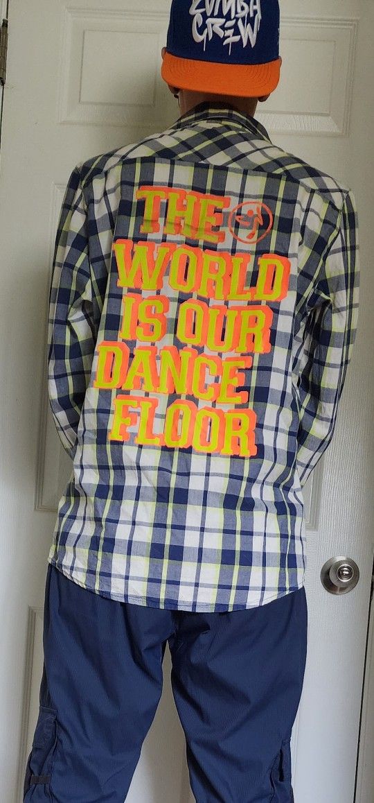 Zumba Wear brand navy and green neon flannel. The back says "The World is Our Dance Floor" in yellow and orange along with the Zumba logo. This piece is so fun to style and is great to throw on after cooling down after class! All pieces are clean and come from a smoke free pet-loving home! Pickup only in Norfolk. I am selling a lot more Zumba stuff too so keep an eye out! Zumba has brought me so much joy over the years, but I don't go to as many classes as I used to and I don't teach anymore. I hope someone else can enjoy these pieces as much as I have! If you are an instructor or planning to be an instructor, or want to bundle pieces, I will give you a discount. :)