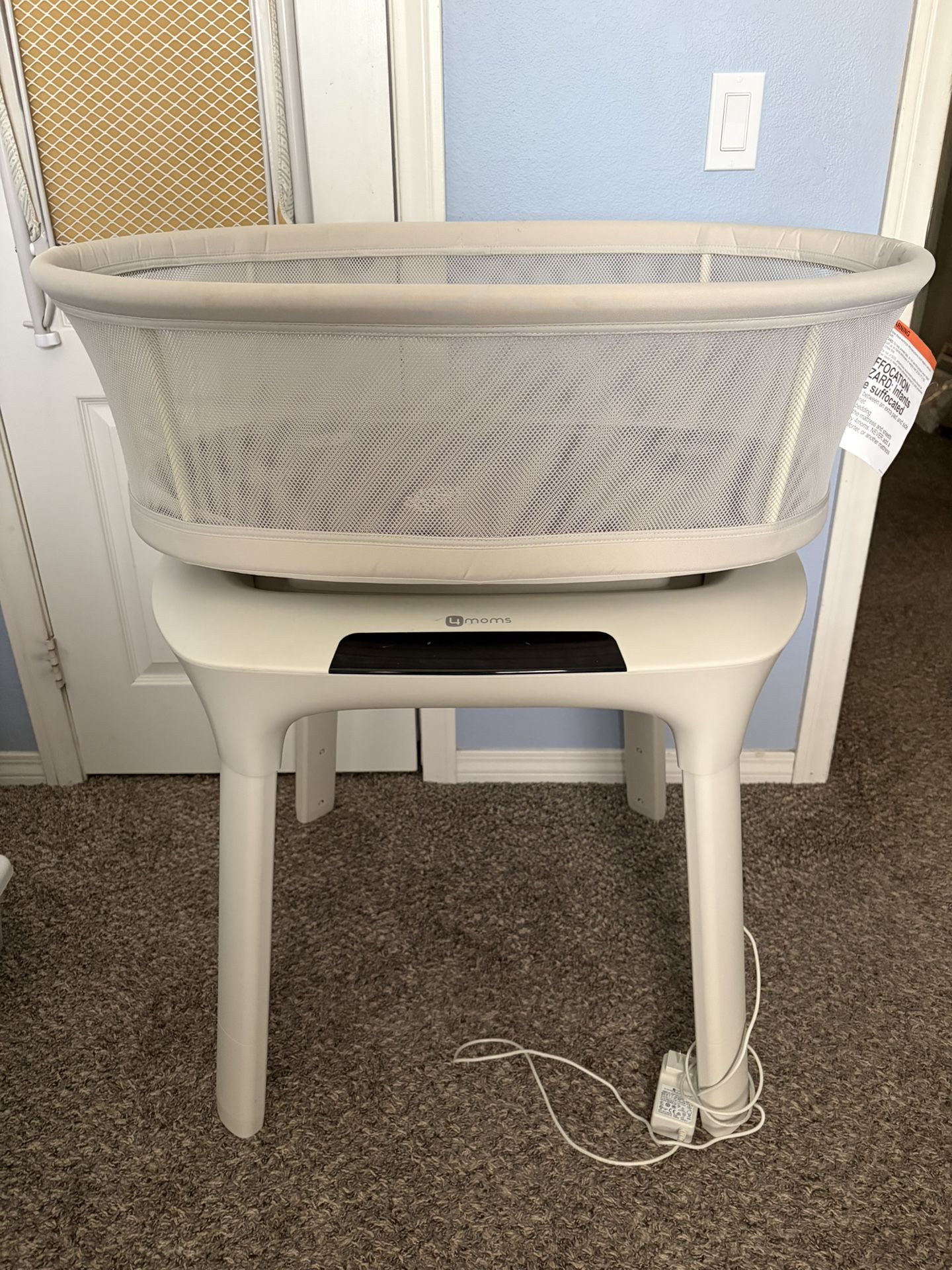 Mamaroo baby bassinet by UPPAbaby (previously 4Moms). Bassinet features 5 different motion settings and 4 white noise options. Can also bluetooth connect bassinet to UPPAbaby app to start up motion and white noise. Was able to use for both my kiddos, such a lifesaver for new parents. Works as great as the first day we used it.