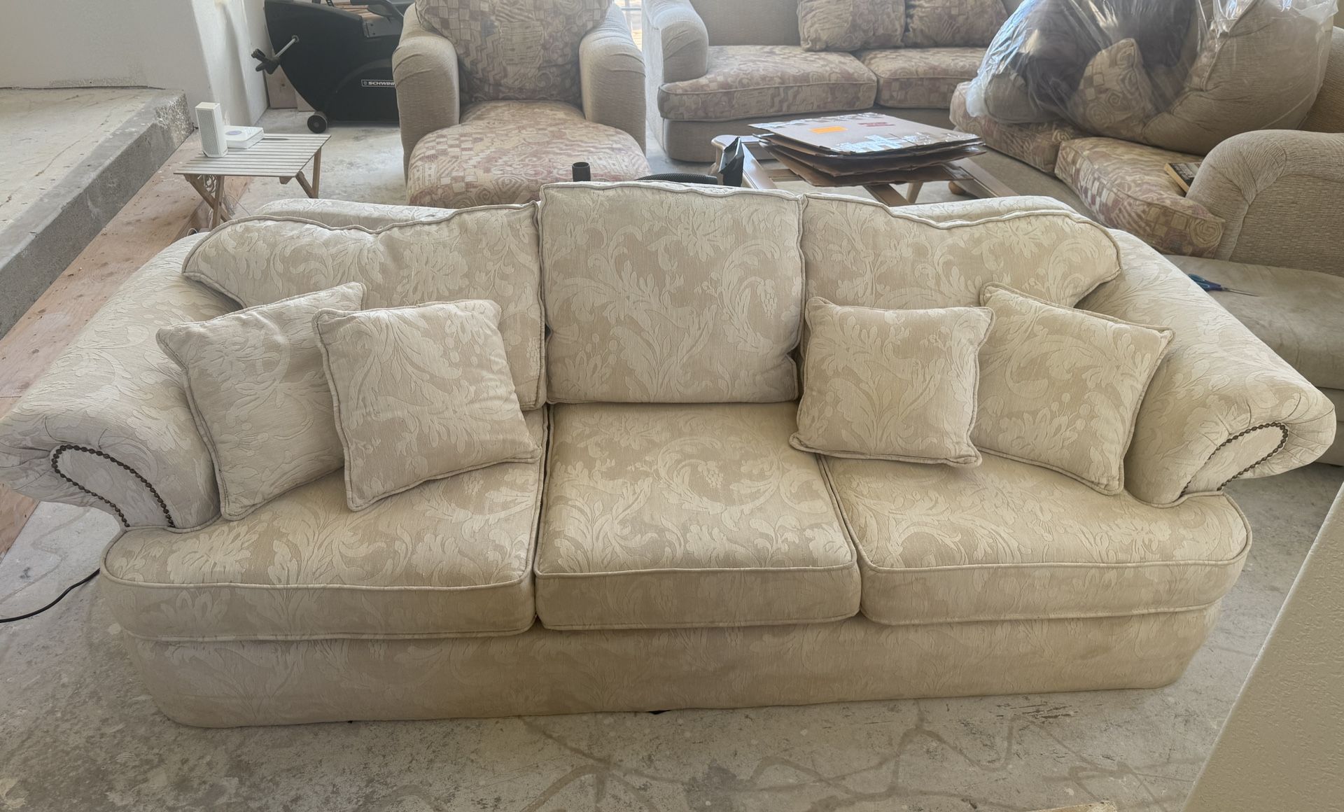 Cream, off white couch & oversize chair. In good condition. Lots of extra pillows $100 for both Please excuse photos, our house is under construction