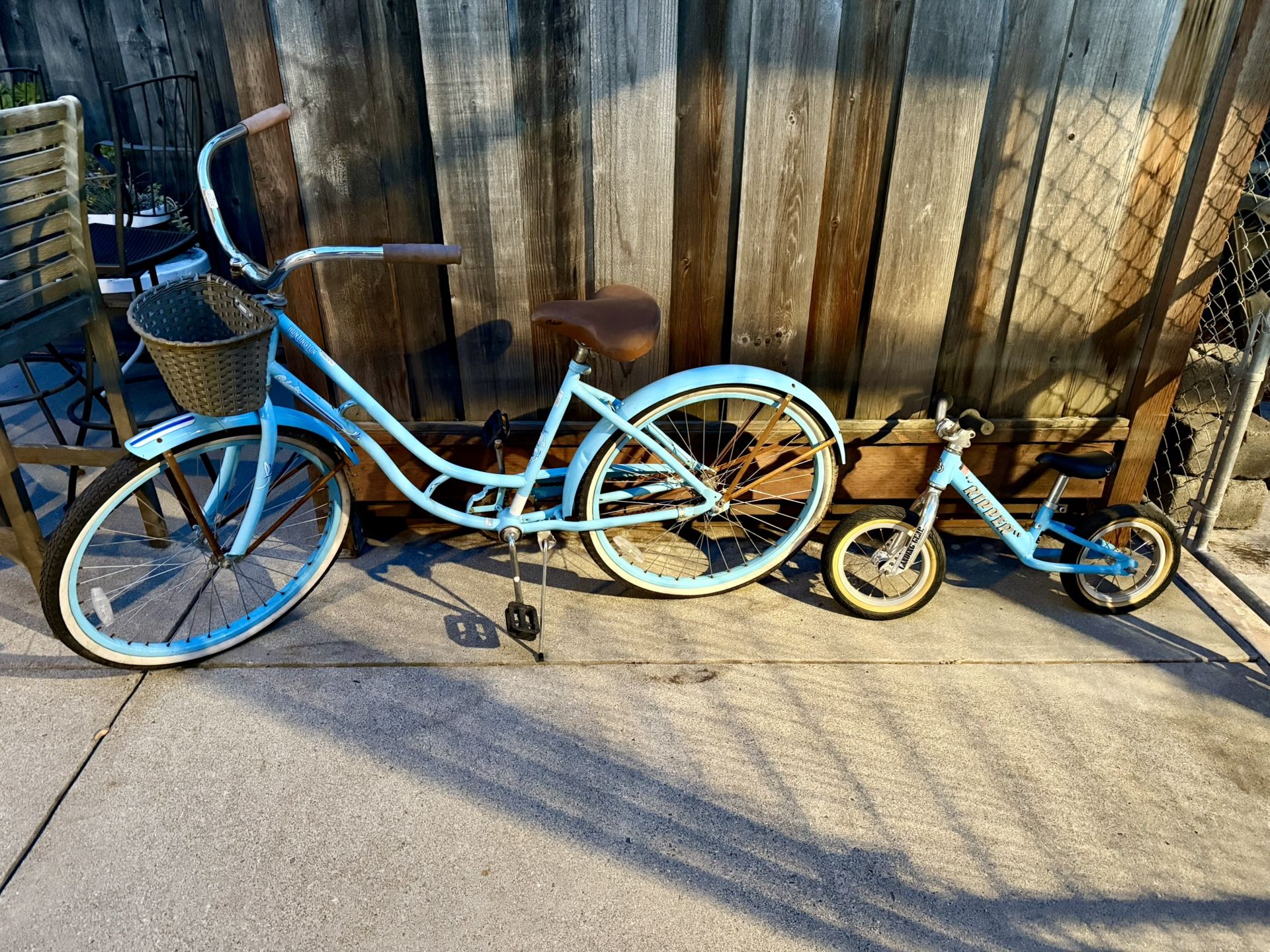 Includes a blue adult bicycle with basket and a matching toddler blue balance bike. $60 for beach cruiser $40 balance bike *** all tires need air***