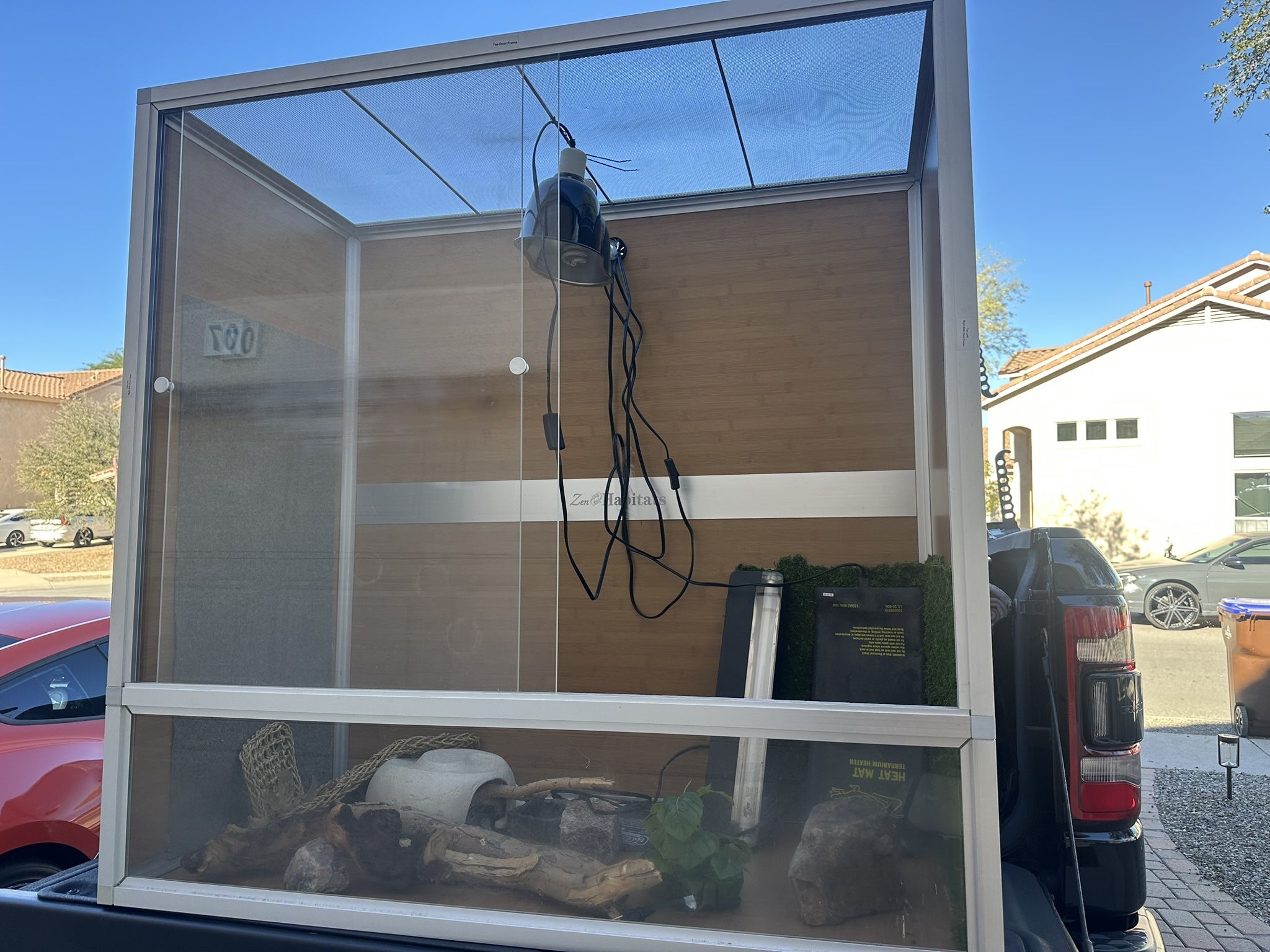 Huge enclosure for your little dragon. With lights heaters and decorations all included. Opens in the front so you don’t scare them!! Or best offer