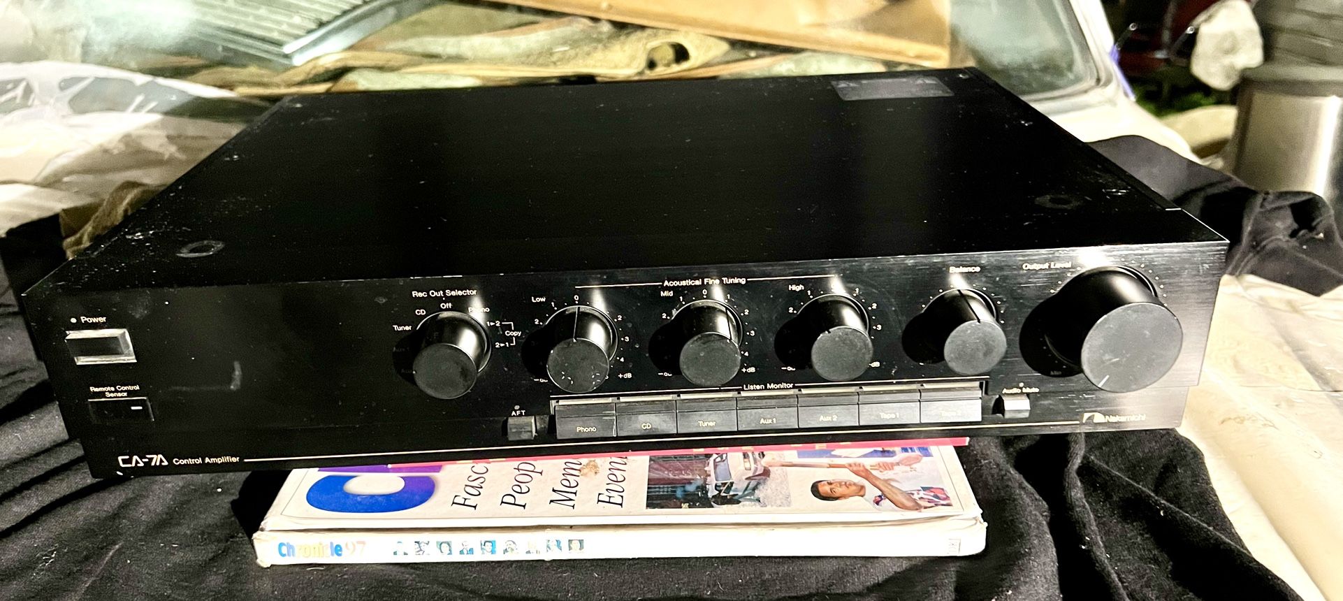 Frequency Response: 1 Hz – 100 kHz Total Harmonic Distortion (THD): ~0.002% Signal-to-Noise Ratio (S/N): Line: 94 dB MM Phono: 88 dB MC Phono: 84 dB Input Sensitivity: Line: 150 mV MM Phono: 2.5 mV MC Phono: 0.16 mV Output: 2V (Preout), 7V Max Dimensions (WHD): 17.13" x 3.29" x 12.20" (435 x 82 x 310mm) Weight: 20 lbs (7.2 kg) Key Features: All-Analog Design: Uses high-quality film capacitors and low-tolerance components in the signal path. Dual Toroidal Power Supplies: Separate transformers for the phono stage and line stage. Advanced Phono Stage: Built-in loading adjustments for Moving Coil (MC) cartridges. Tone Controls: Bypassable 3-band "Acoustic Fine Tuning" (low, mid, high). Remote Control: Capable of controlling other Nakamichi components like tape decks. Build Quality: Aluminum chassis with gold-plated connectors. Inputs: Phono (MC/MM), CD, Tuner, Aux, plus two tape loops.