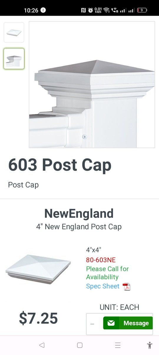 New England - 4 Inch X 4 Inch Vinyl Post Cap. Its looks new, I have only used it for 1 week. After that, I have replaced my Vinyl Post Cap with Solar Light Cap and I am not using it anymore. I have 30 piece of this. This is good quality one. You will get this in market between $6 to $7 each.