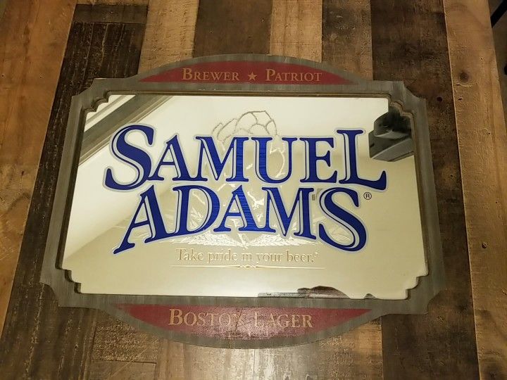 SAMUEL ADAMS BOSTON LAGER BREWER PATRIOTIC WOODEN - FRAMED BEER MIRROR ADVERTISING SIGN