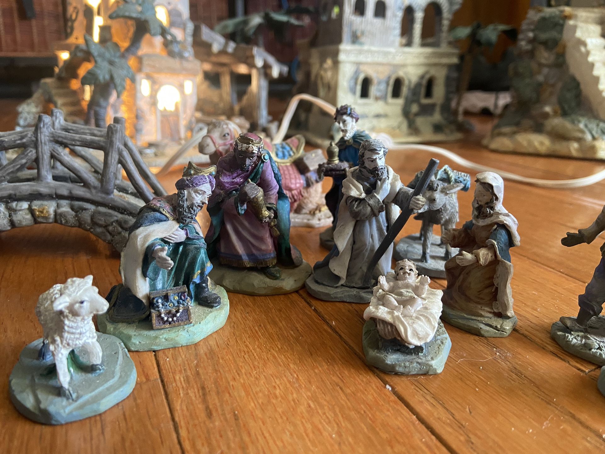 Porcelain pottery made town that lights up 40pieces of people and the town itself with palm trees a bridge and animals. I love this display, I had it in my bay window for years my husband wanted a change. So I hope the next owner will love it as I did. I kept it in year round because we live in Bethlehem!