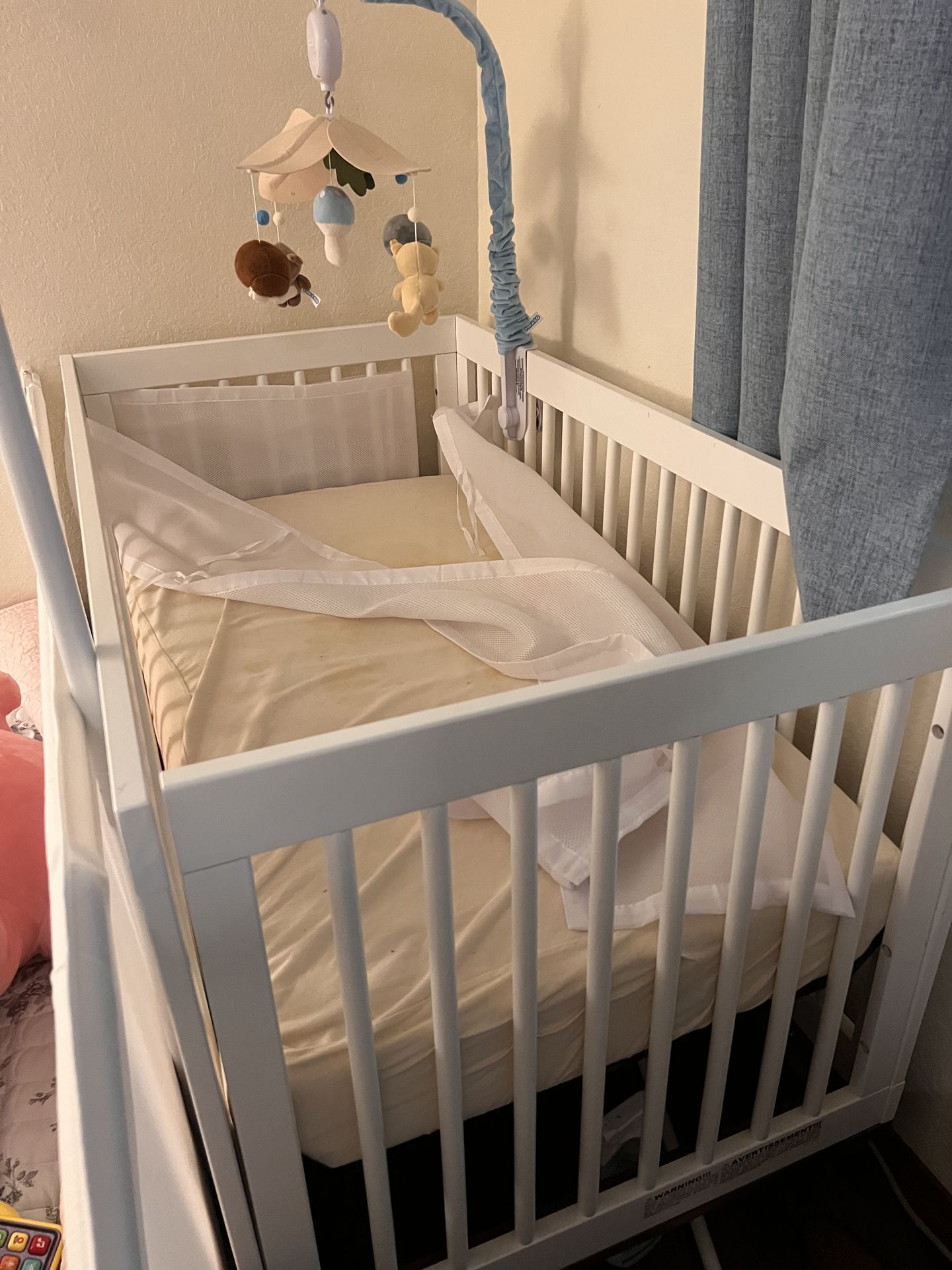 Expensive crib and naturpedic organic mattress we got for about $300. Will throw in the crib carousel and breathable mesh liner and $63 naturpedic organic breathable crib sheet(washed) for free! We were really concerned about safe sleep and made this expensive purchase but our son just doesnt like cribs.