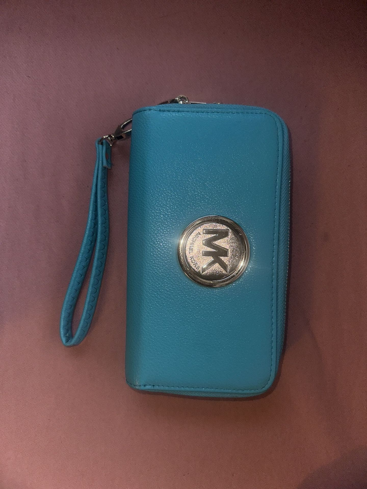 Selling a cute Michael Kors wallet! It's a vibrant aquamarine color and has a convenient wrist strap. Perfect for keeping your cards and cash organized. Phone holder.