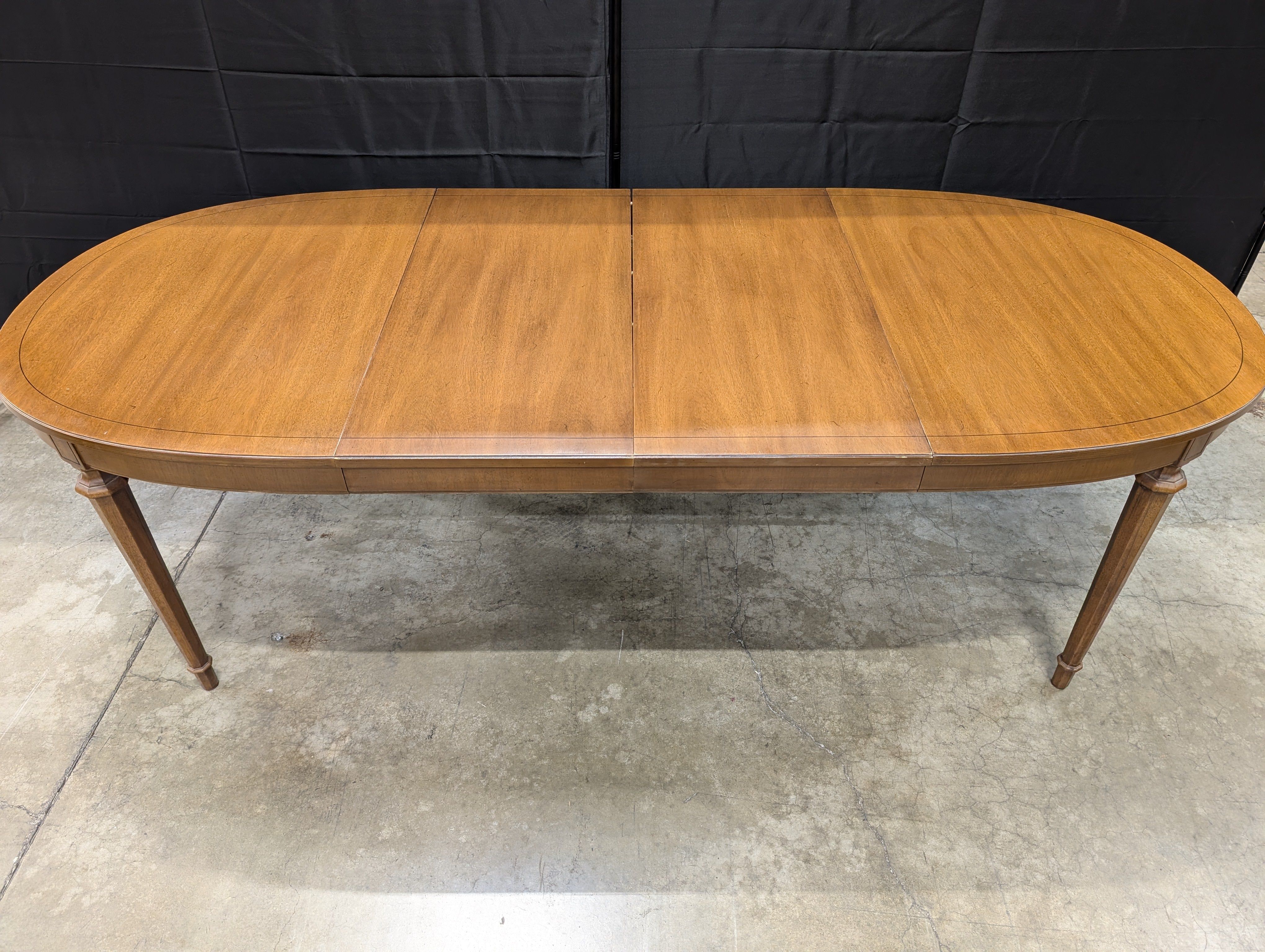 This table features an oval wood top with a distinctive dark inlay line around its perimeter. It stands on four tapered, faceted legs. The wood exhibits a medium to dark stain finish.