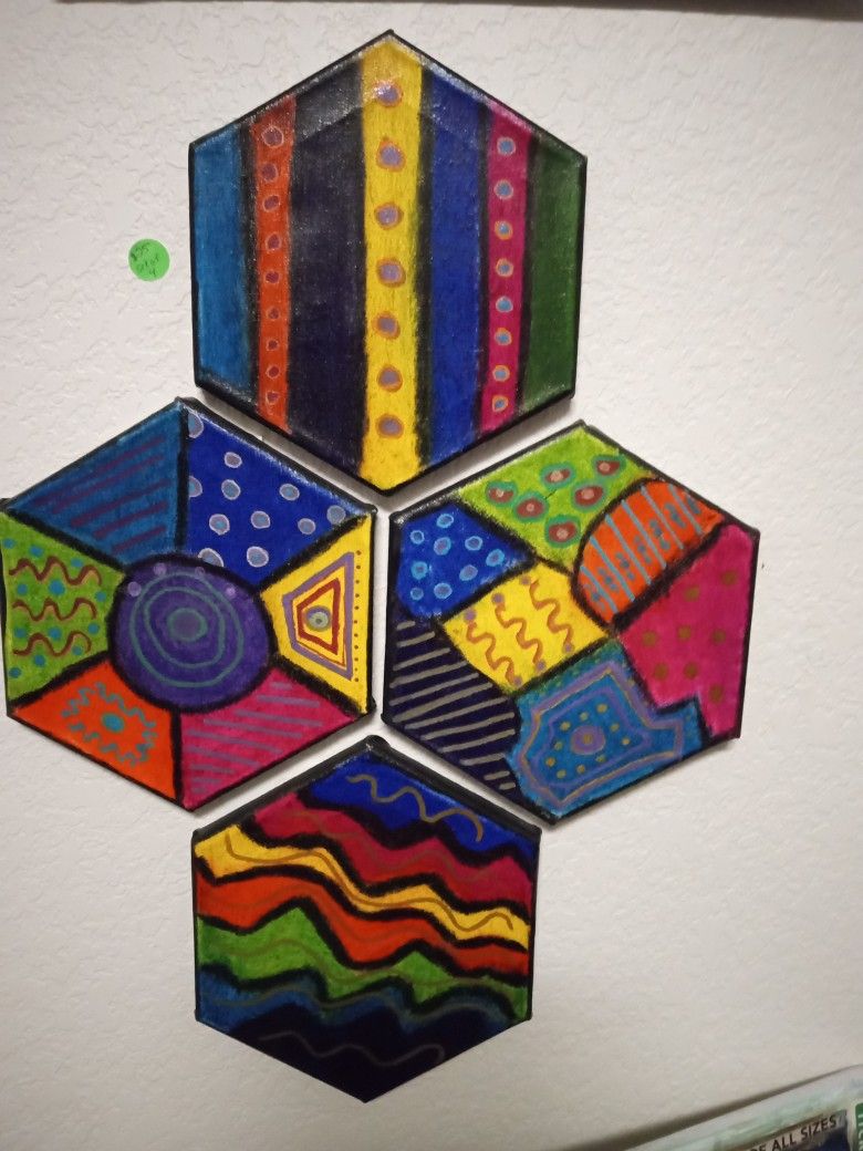 Bring a smile to your face when you look at this grouping. Four hexagons painted with varied marks and colors. Great for kids room, play room, homework area or office. Grown-ups like them too!