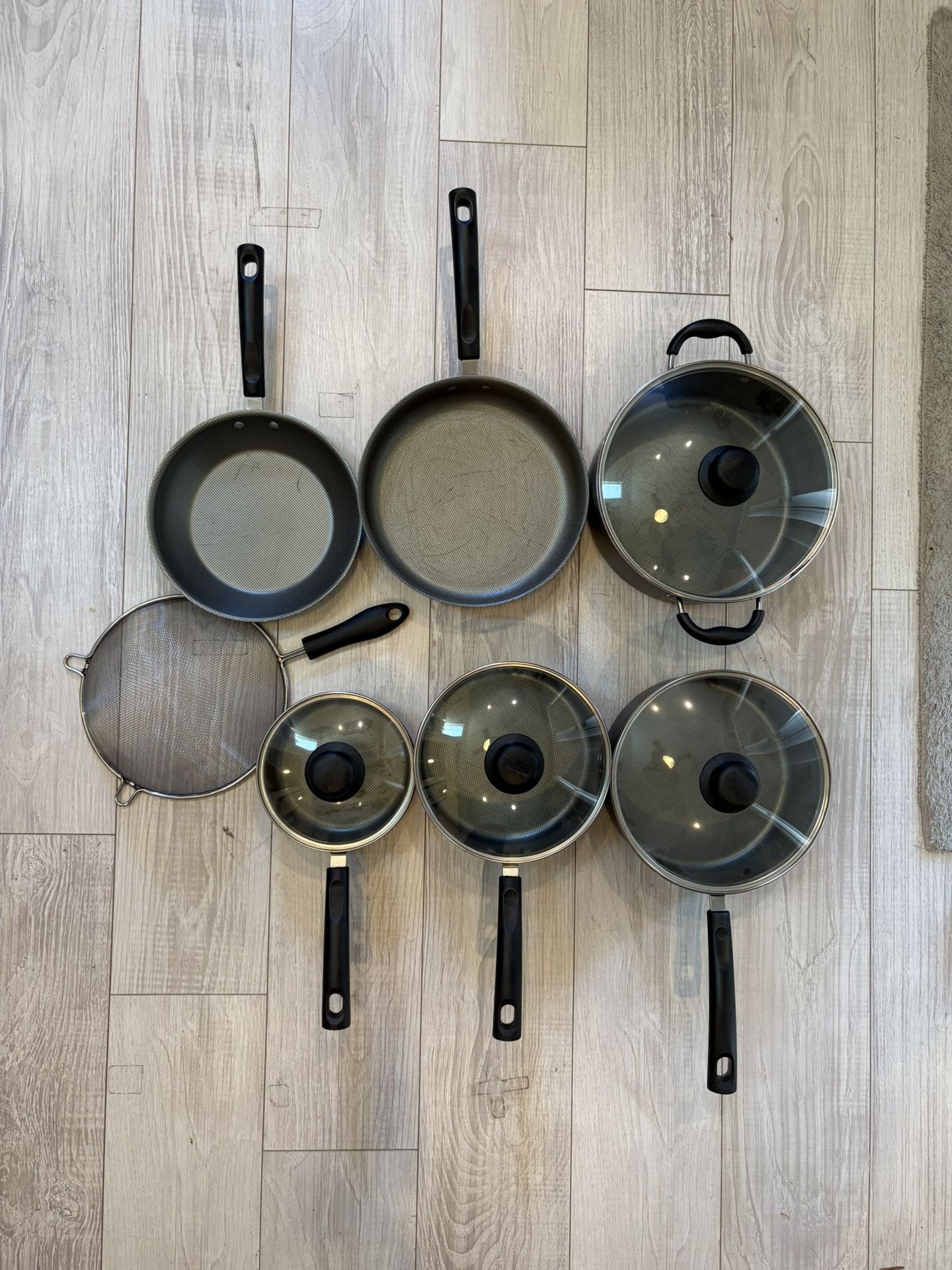 Set includes: 8" saute pan 9" deep saute pan 1 qt saucepan with lid 2 qt saucepan with lid 3 qt saucepan with lid 4 qt Dutch oven with lid **4 qt lid fits the 9" deep saute pan Used cookware set $20