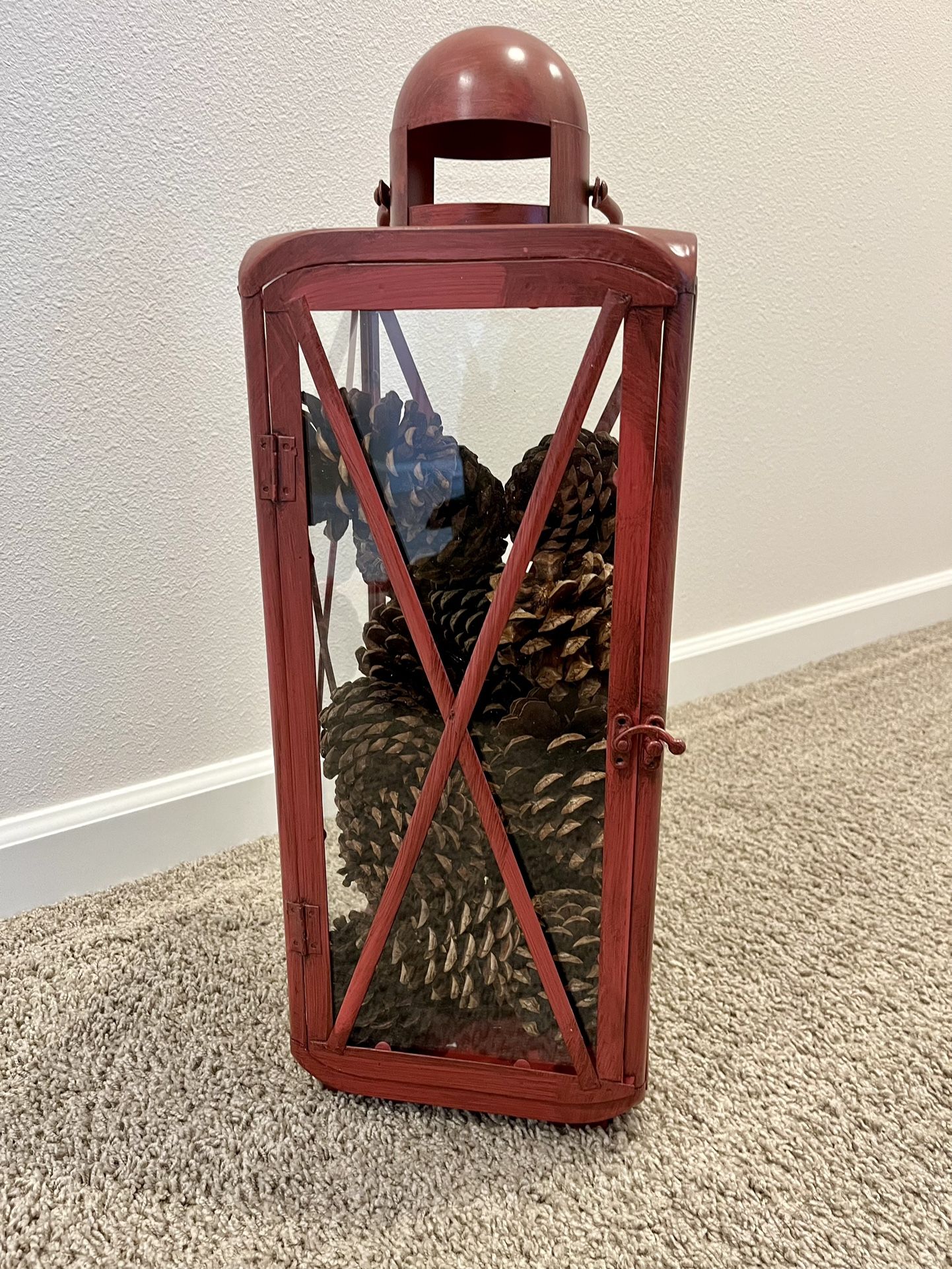 18.5” tall by 8” square deep. Has glass door with hook clasp and handle. Excellent condition.
