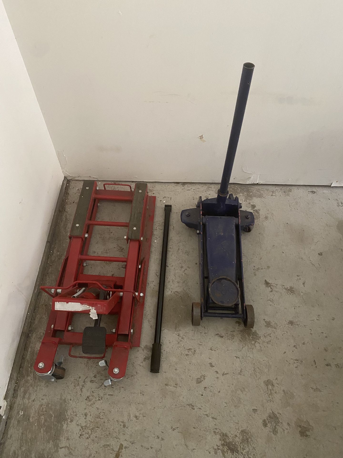 One is a Torin motorcycle jack, the other is a normal one. Must take both. No issues, both work fine, just not new. Pickup and cash only