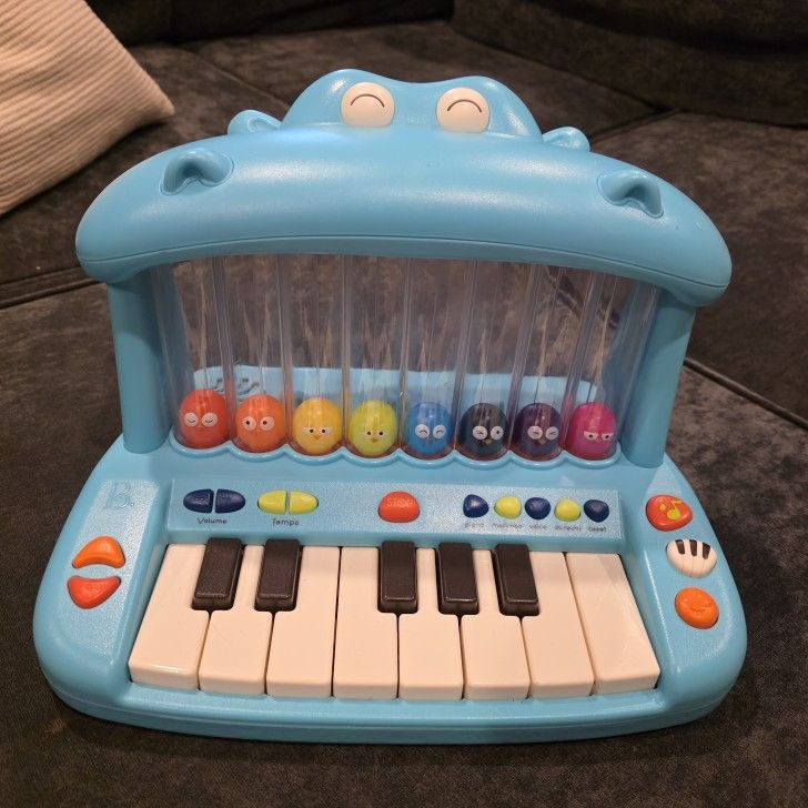 Gently Used B. toys Toy Piano for Kids Hippo Pop Hippo Keyboard: Make the music last all day with a hippo-inspired piano that features lights, songs, sound effects, and 8 popping birds! Musical Features: This play piano includes 5 musical modes and 26 sound effects (4 x AA batteries are required and included). Fun Songs: The Hippo Pop keyboard plays 15 fun songs and 6 nursery rhymes! Birds & Lights: Pressing the tiny hands-friendly piano keys makes 8 colorful birds light up and pop! Smoke-free, pet-free home