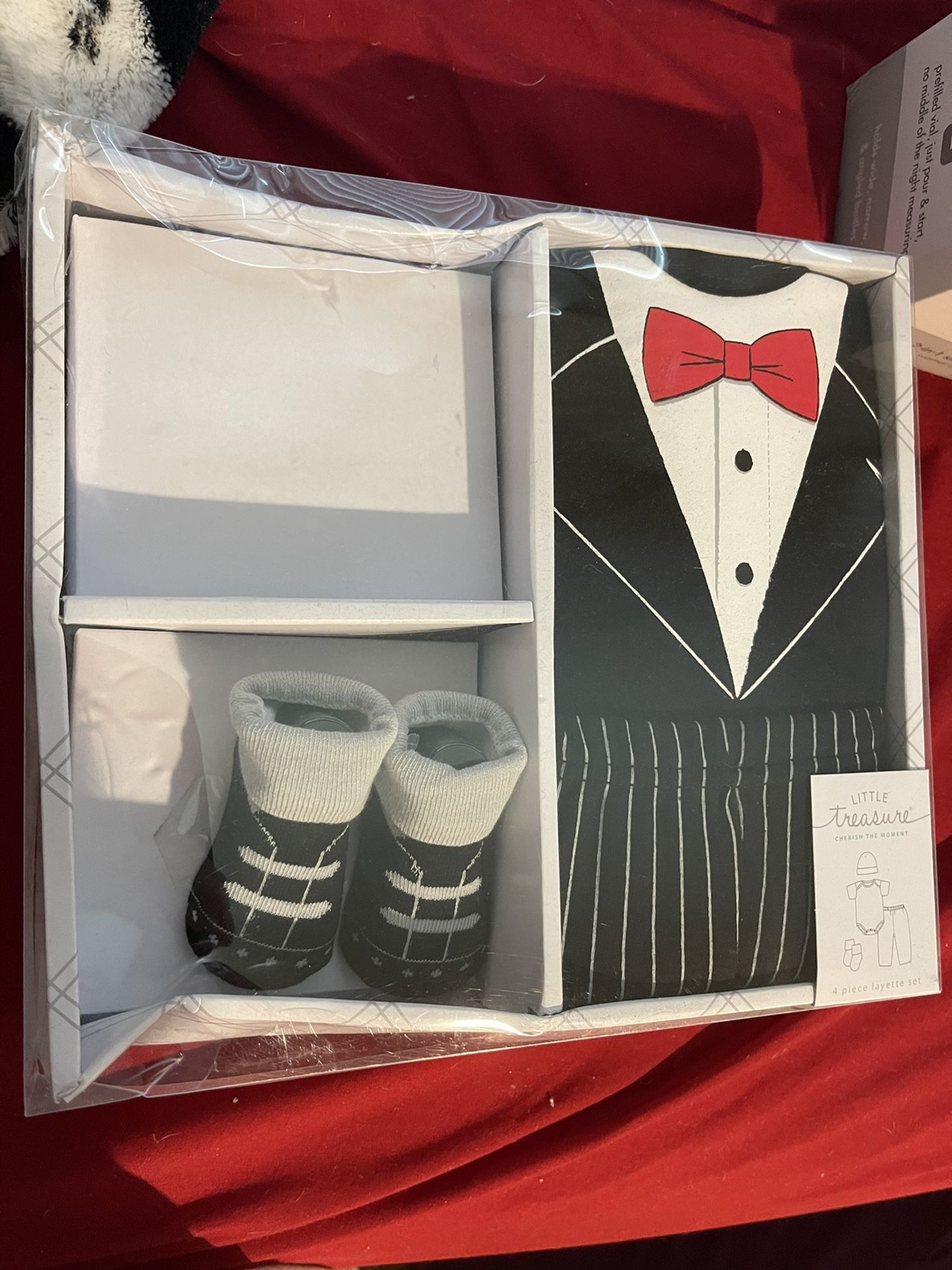 Baby suit size 0-6 months. New in box only thing missing is the hat. My son got a hold of the box and I lost the hat. Everything else brand new has not been touched.
