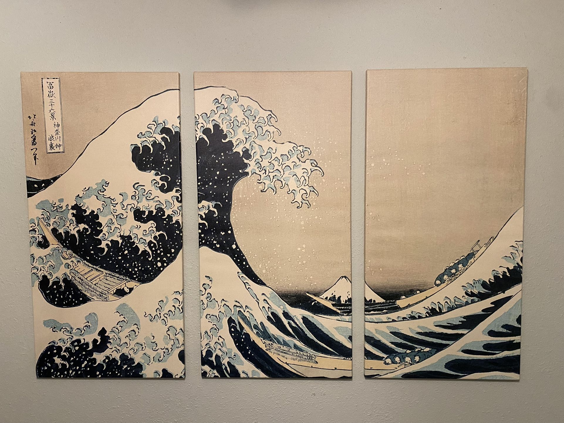Three piece canvas art of The Great Wave Off Kanagawa by Hokusai. Each panel is 40” x 20”