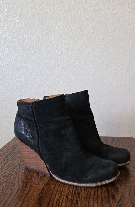 Well-maintained Kork-Ease women's black suede wedge ankle boots. They feature a distressed black suede upper with elastic goring on the sides for easy on and off. The boots have a stacked wooden wedge heel in a natural brown tone. The soles are rubber with a textured pattern and "KORK-EASE" branding. Size 9 with Heel Height of 3" Thank you for viewing. Please feel free to check out my other unique listings.