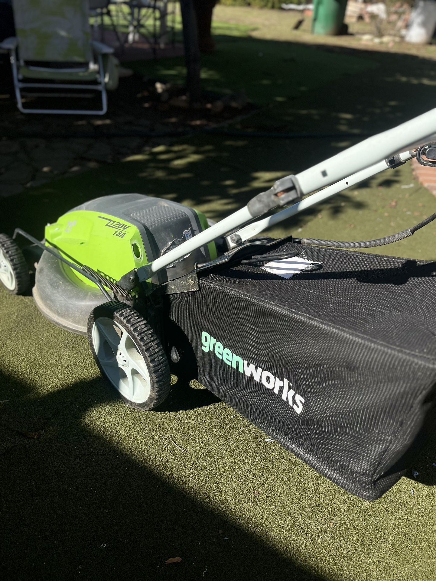 Green Works 120v Nearly new, corded electric lawnmower Works great barely used Lightweight design protects newly growing grass rather than a heavy weight mower 13amp 120v